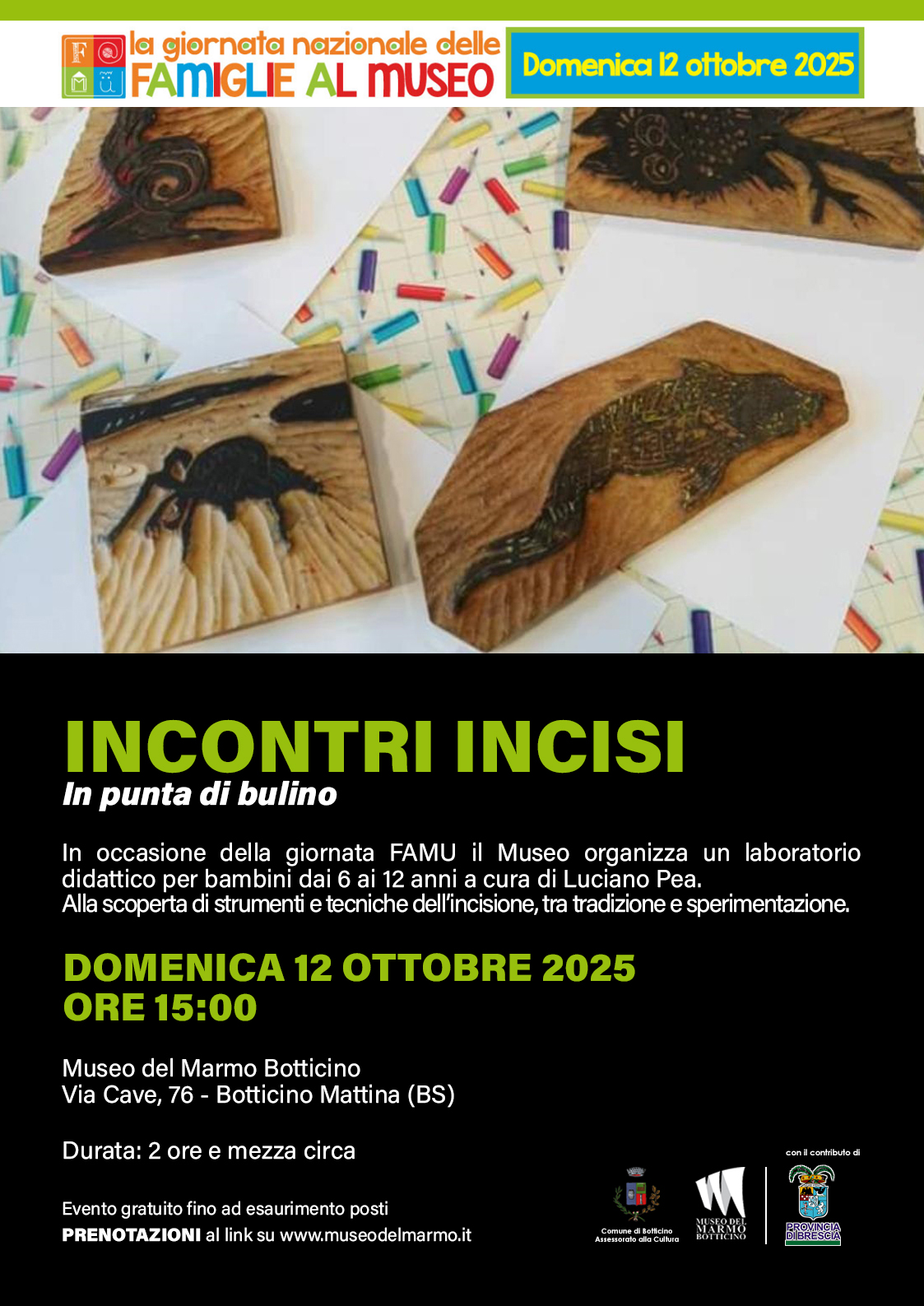 "BOTTICINO DOC. Percorsi, esperienze, identità" il Comune di Botticino, con la collaborazione del Museo del Marmo Botticino e con il contributo della Provincia di Brescia, in occasione della giornata FAMU organizza un laboratorio didattico per bambini dai 6 ai 12 anni a cura di Luciano Pea.