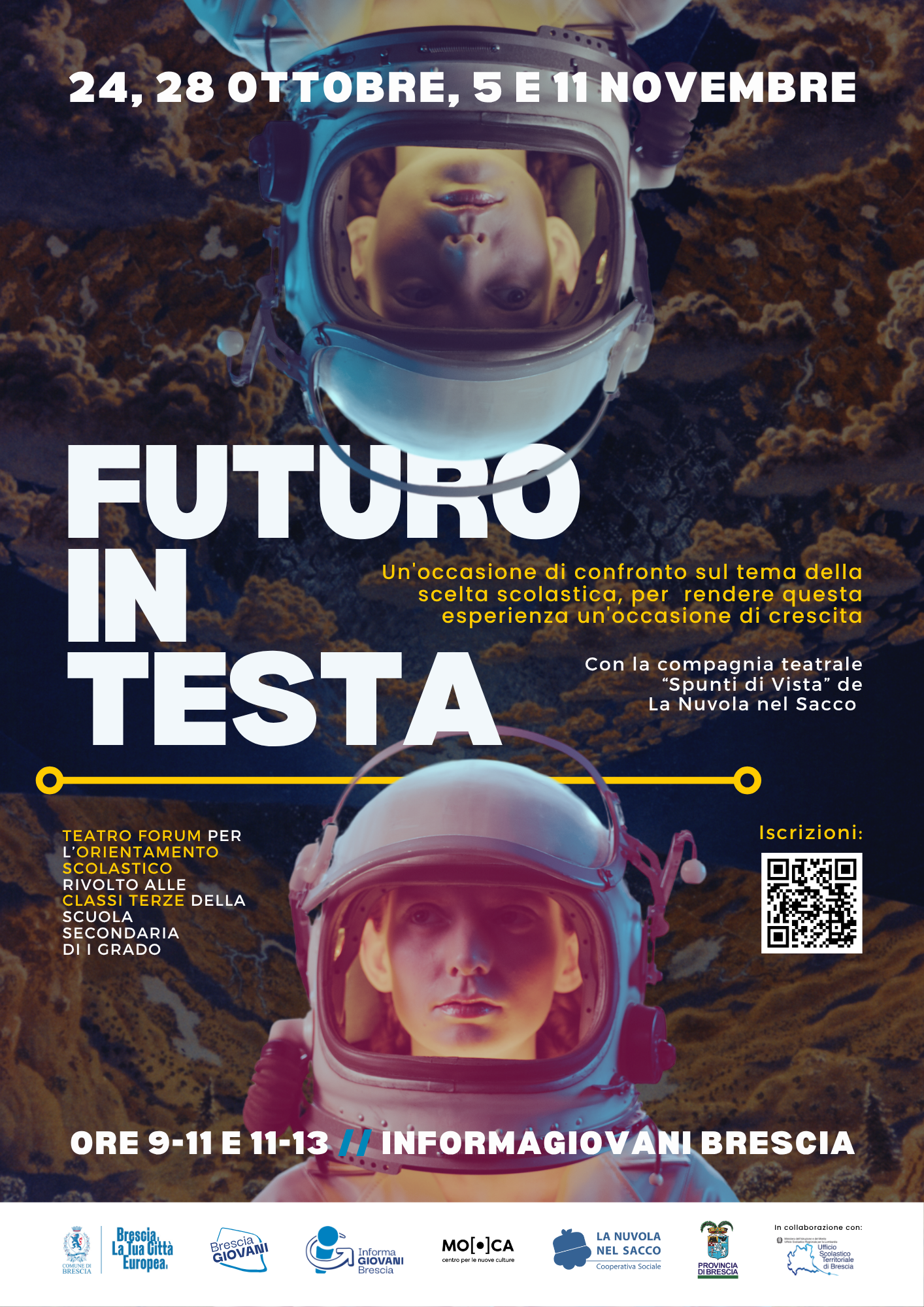 Teatro forum innovativo per l'orientamento scolastico dedicato alle classi terze della scuola secondaria di primo grado. La Compagnia teatrale "Spunti di vista" utilizza tecniche di teatro partecipativo per coinvolgere attivamente gli studenti in simulazioni che affrontano dubbi, paure e aspettative sulla scelta della scuola superiore.