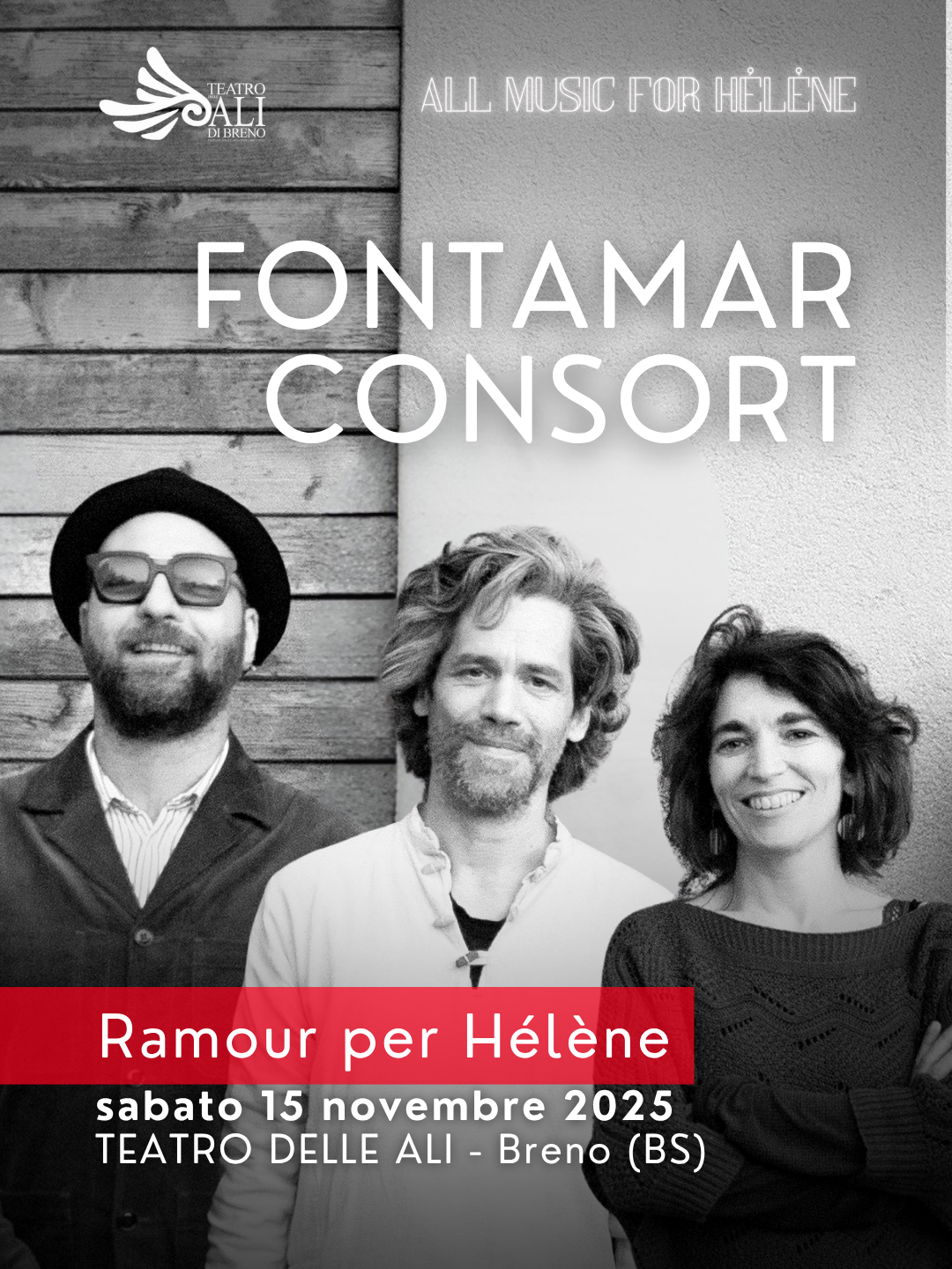 Il Teatro delle Ali di Breno ospita "Ramour per Hélène", concerto del Fontamar Consort con Laurianne Langevin, Jean Fontamar e Marco Bardoscia. Sul palco del teatro che non sarebbe esistito senza di lei, i tre musicisti offriranno al pubblico una serata di intensa poesia sonora con un concerto che è insieme omaggio, gratitudine e condivisione di quella bellezza e curiosità intellettuale che Hélène ha sempre trasmesso e ispirato.
