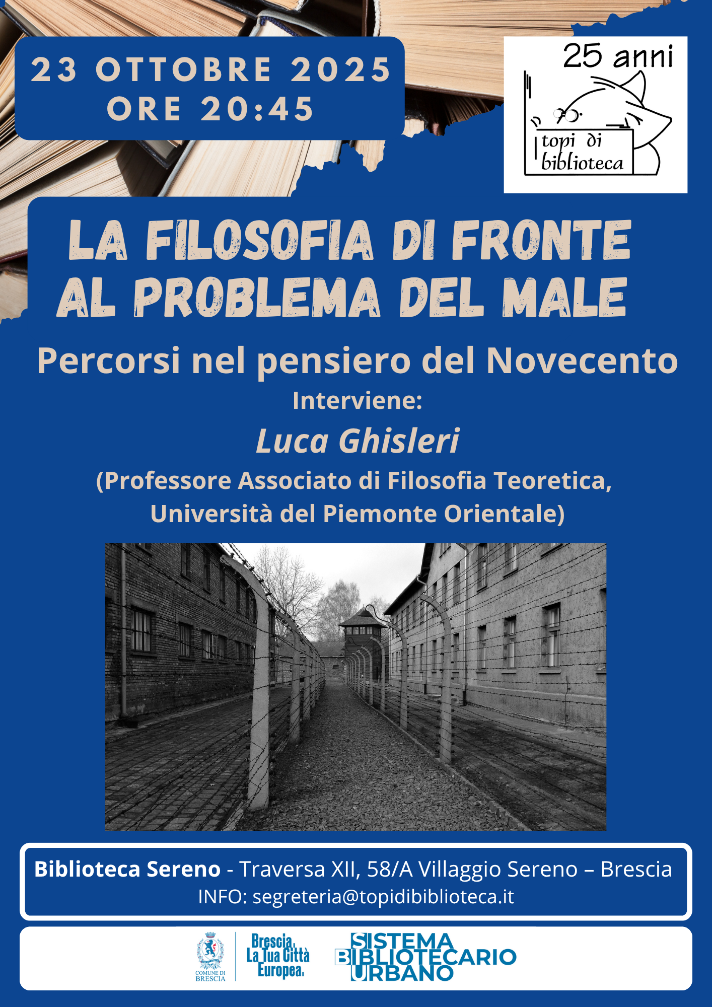 Incontro intitolato "La filosofia di fronte al problema del male. Percorsi nel pensiero del Novecento" - in cui interverrà Luca Ghisleri (professore di Filosofia teoretica presso l'Università del Piemonte Orientale).