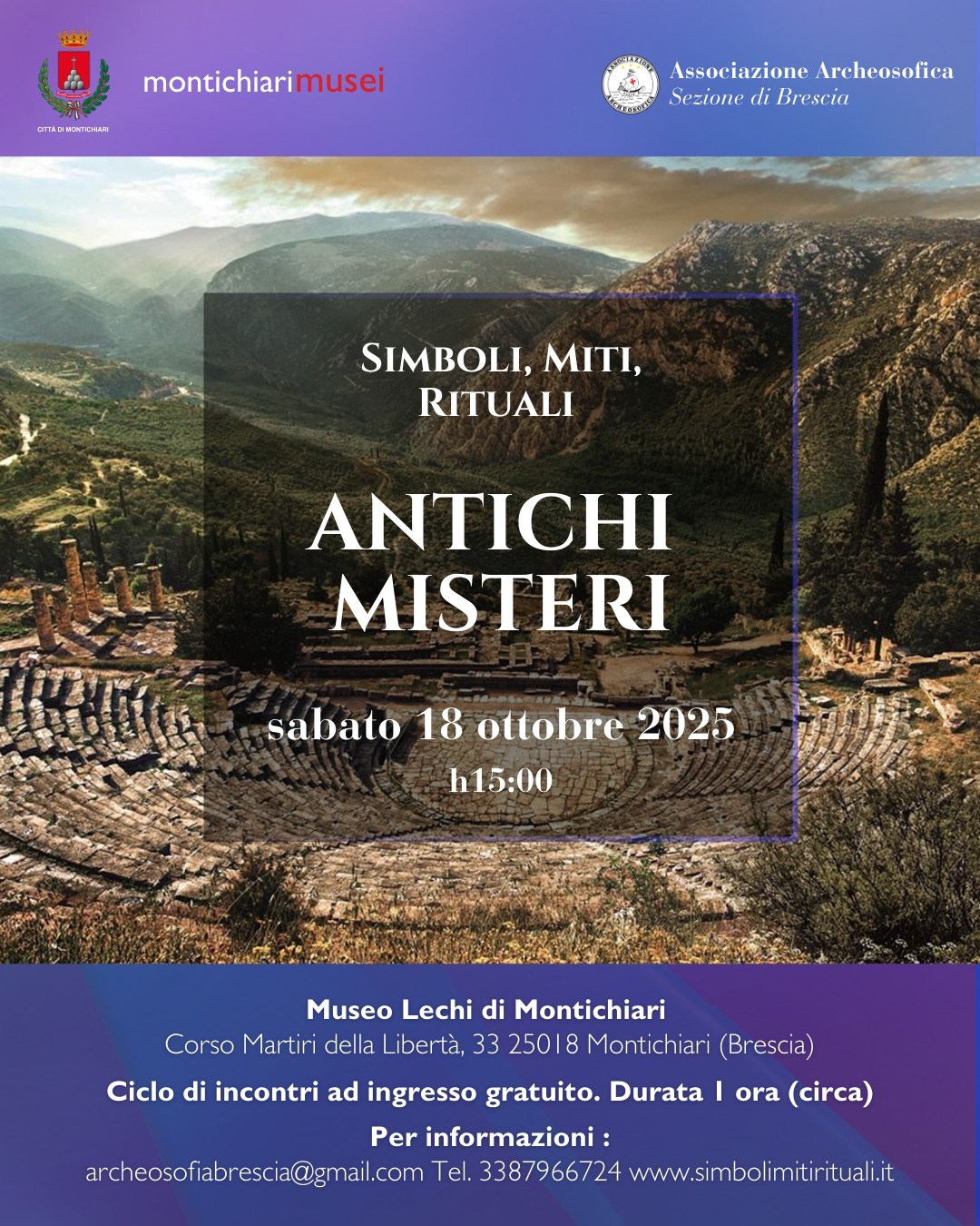 Il ciclo è nato con finalità divulgative da un gruppo di approfondimento composto da nove amici e membri dell'Associazione Archeosofica. Tra questi, la Dott.ssa Silvia Di Santo (laureata in Lettere Classiche con specializzazione in Archeologia Classica) e la Dott.ssa Gina Lullo (dottore di ricerca in Storia dell'Arte Medievale), che hanno contribuito attivamente alle ricerche e agli approfondimenti sui temi trattati. L'iniziativa si inserisce nel ciclo culturale "Simboli, Miti, Rituali" ed è realizzata con il patrocinio e la compartecipazione del Comune di Montichiari e di Montichiari Musei. «Con "Antichi Misteri" desideriamo offrire al pubblico un viaggio breve ma rigoroso tra culture diverse, evidenziando la continuità dei simboli e il loro valore per comprendere il mondo di oggi», dichiarano gli organizzatori.