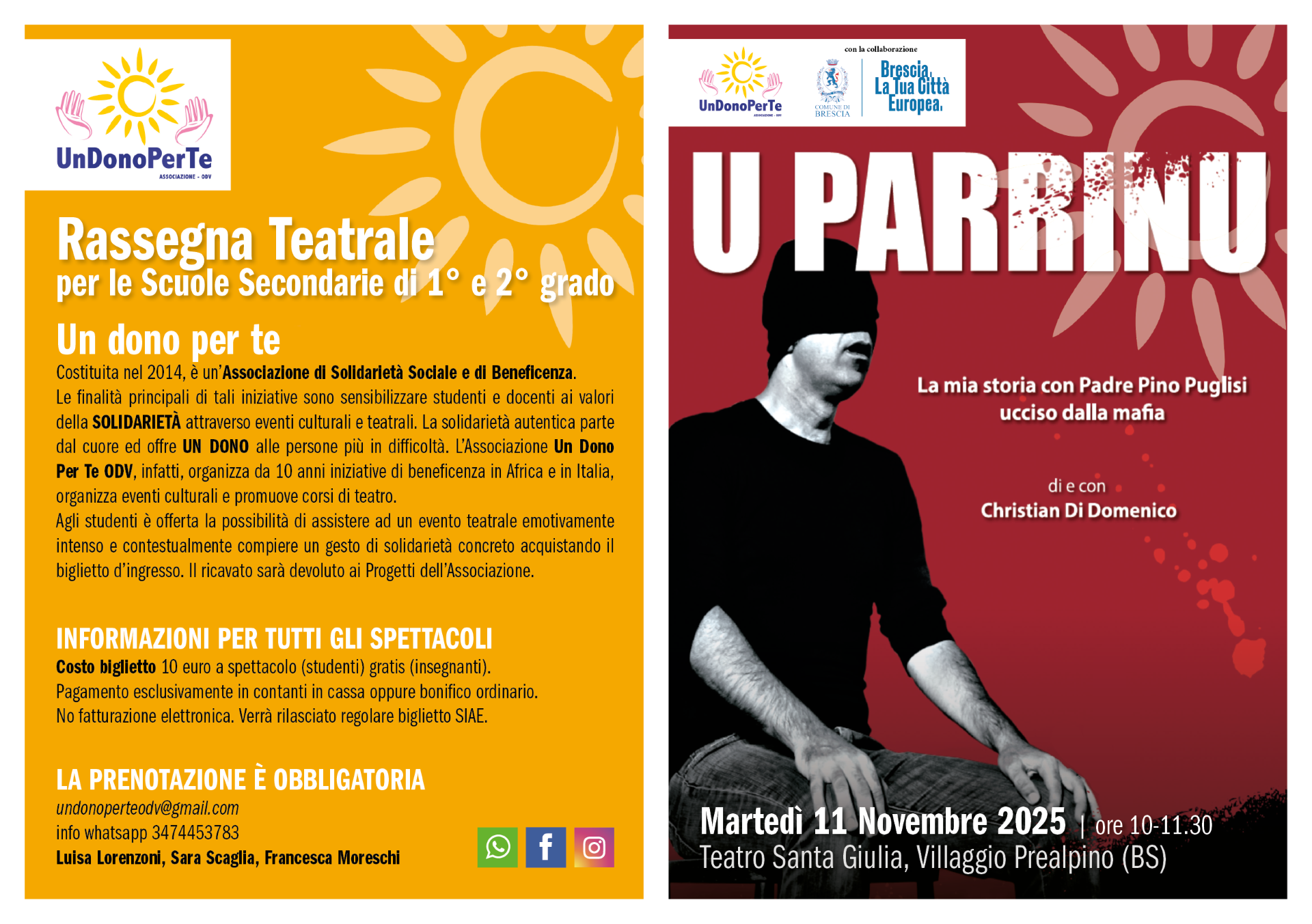 Spettacolo nell'ambito della rassegna teatrale proposta dall'Associazione Un Dono Per Te ODV di Brescia, con il patrocinio del Comune, per avvicinare gli studenti delle Scuole Secondarie di primo e secondo grado della città e provincia a produzioni teatrali di alta qualità al fine di coinvolgerli verso alcune significative tematiche.