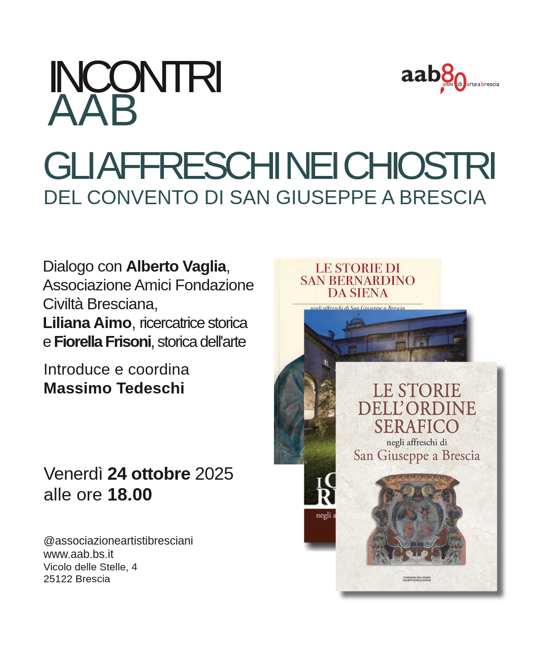 L’appuntamento intende approfondire il valore storico e artistico del complesso conventuale e dei suoi affreschi, un patrimonio di straordinaria importanza per la storia dell’arte bresciana. L’occasione nasce dal recente completamento di un restauro virtuale che ha restituito nuova vita ai dipinti del primo chiostro: lunette, tondi e riquadri che raccontano, con intensità e varietà di scene, episodi popolati da numerosi Santi e Beati francescani.