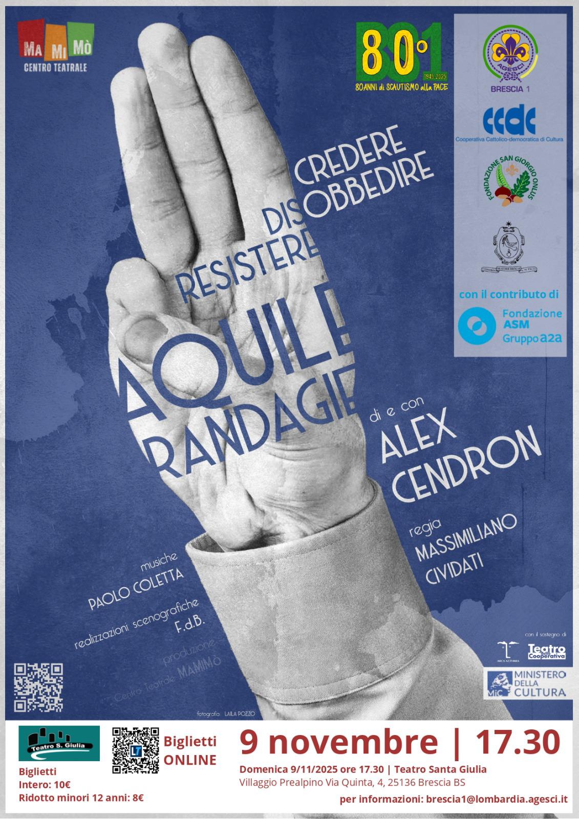 Il gruppo scout Brescia 1- in collaborazione con CCDC, Padri della Pace e Fondazione S.Giorgio - in occasione dei festeggiamenti per gli 80 anni del gruppo, invita allo spettacolo "quile Randagie - credere disobbedire resistere" di Alex Cendron.