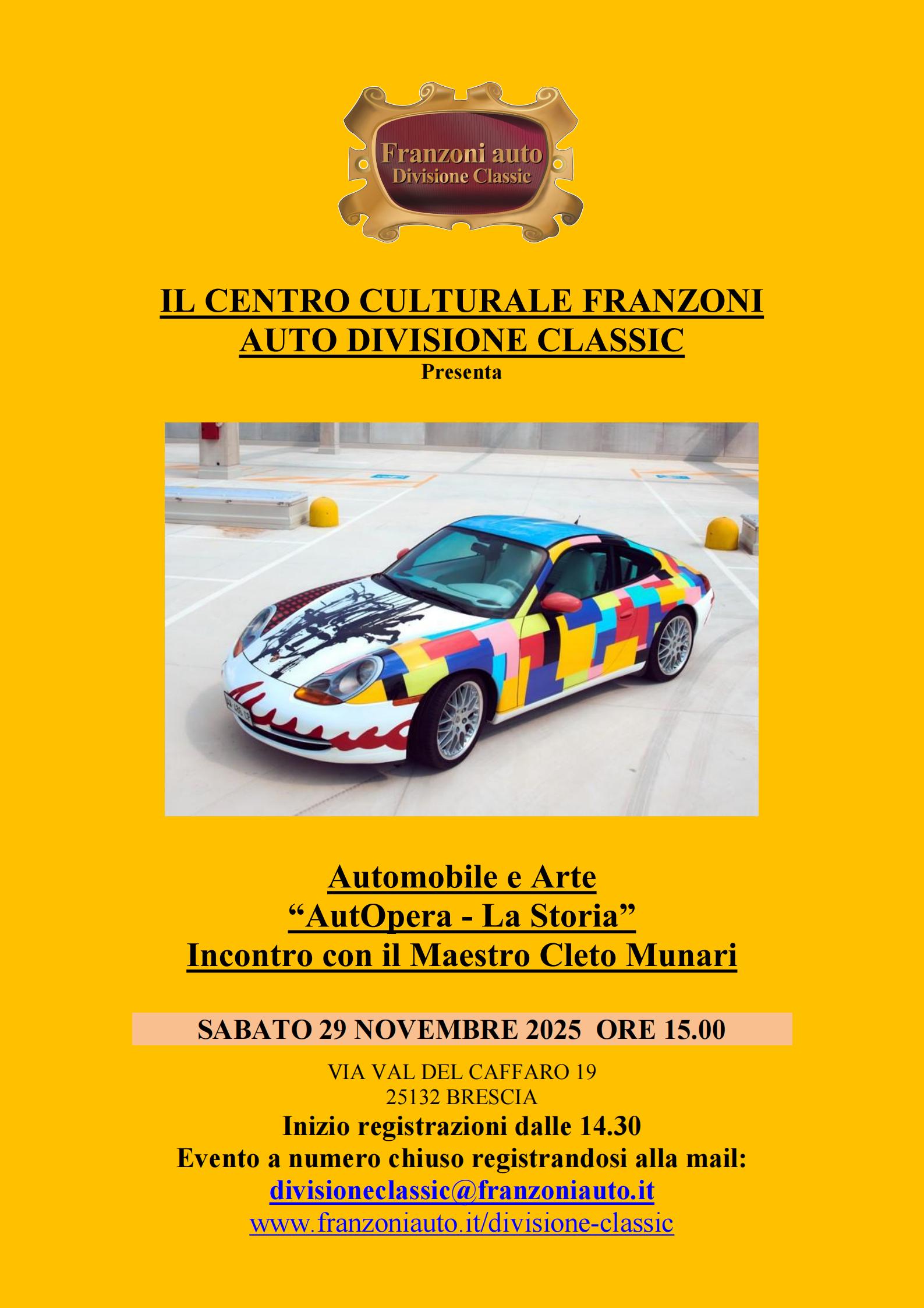 AutOpera: come un'automobile diventa un'Opera d'Arte Sabato 29 Novembre 2025, alle ore 15.00, il Centro Culturale Franzoni Auto Divisione Classic di Brescia, in Via Val del Caffaro 19, invita a partecipare ad un incontro intrigante ed inedito.