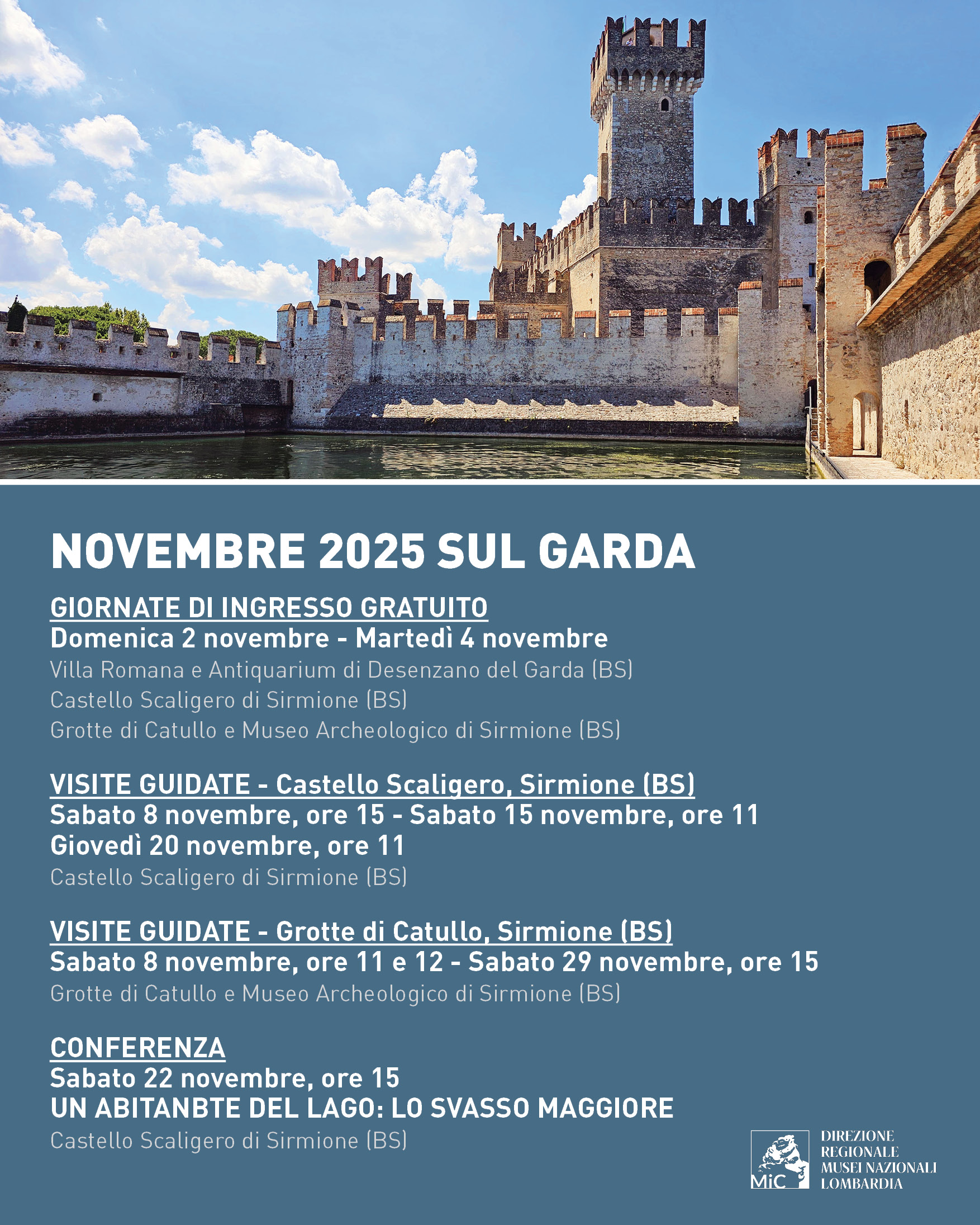 Nel mese di novembre proponiamo una serie di appuntamenti dedicati alla scoperta del Castello Scaligero di Sirmione, una delle più affascinanti fortificazioni lacustri del lago di Garda. La rocca conserva ancora oggi una suggestiva darsena, che accoglie una piccola parte del lago e ricorda il profondo legame tra il castello e l’acqua. La prenotazione è consigliata, drm-lom.didattica@cultura.gov.it