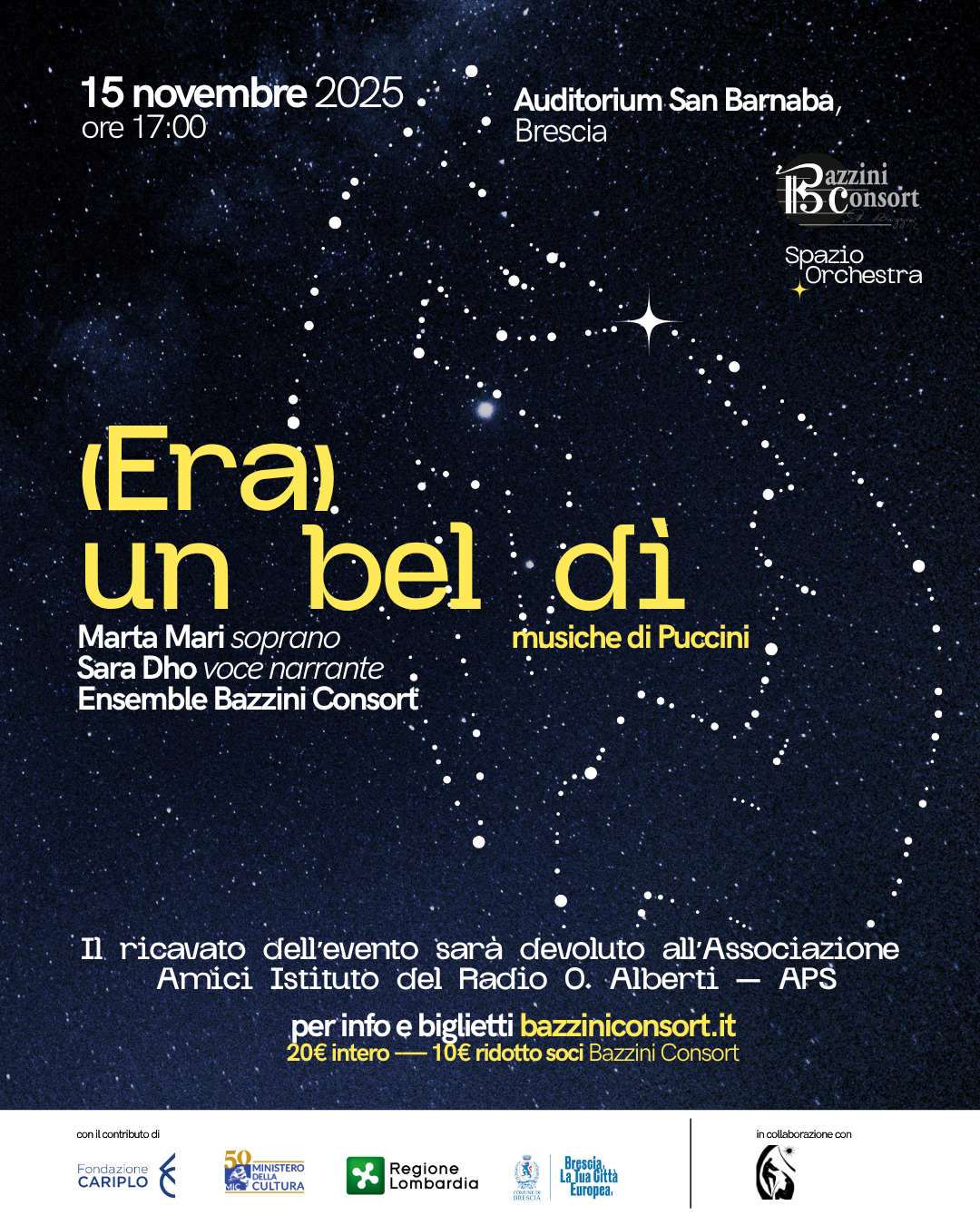 L'intero ricavato sarà devoluto all'Associazione Amici Istituto del Radio "O. Alberti", unendo così arte e solidarietà. Sul palco, l'Ensemble Bazzini Consort accompagnerà la soprano Marta Mari, che interpreterà alcune tra le arie più celebri delle protagoniste pucciniane.