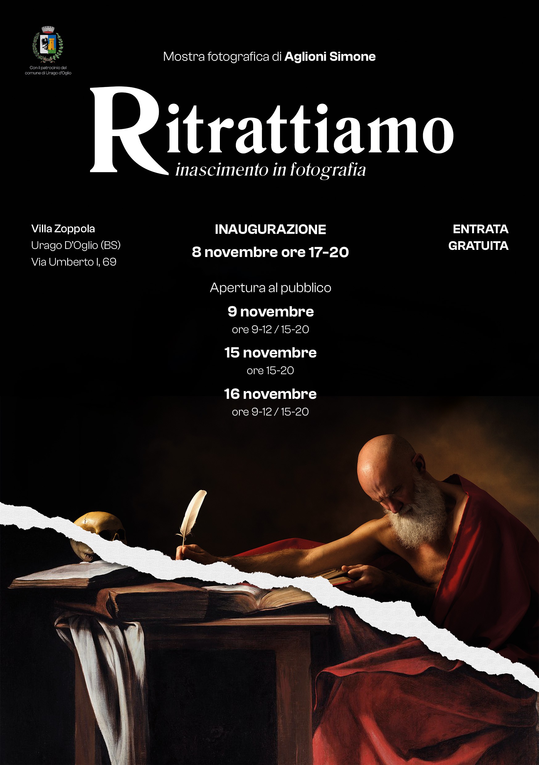 Dall' 08 novembre al 16 novembre, presso la Villa Zoppola di Urago d'Oglio (BS) (scuole medie), sarà allestita la mostra personale di Simone Aglioni intitolata: "Ritrattiamo - Rinascimento in fotografia".