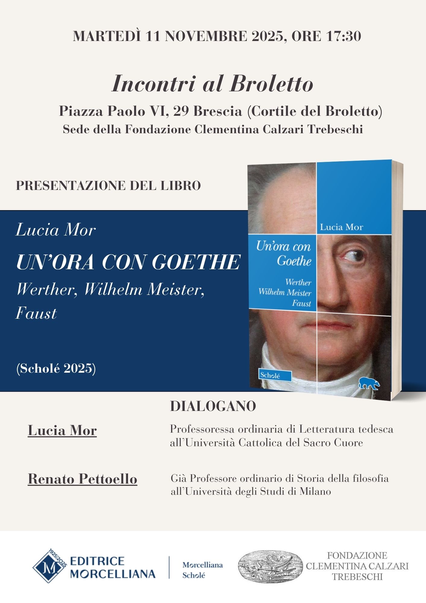 Presentazione del libro Lucia Mor Un'ora con Goethe Werther, Wilhelm Meister, Faust (Scholé 2025) Dialogano Lucia Mor, Professoressa ordinaria di letteratura tedesca all'Università Cattolica del Sacro Cuore Renato Pettoello.