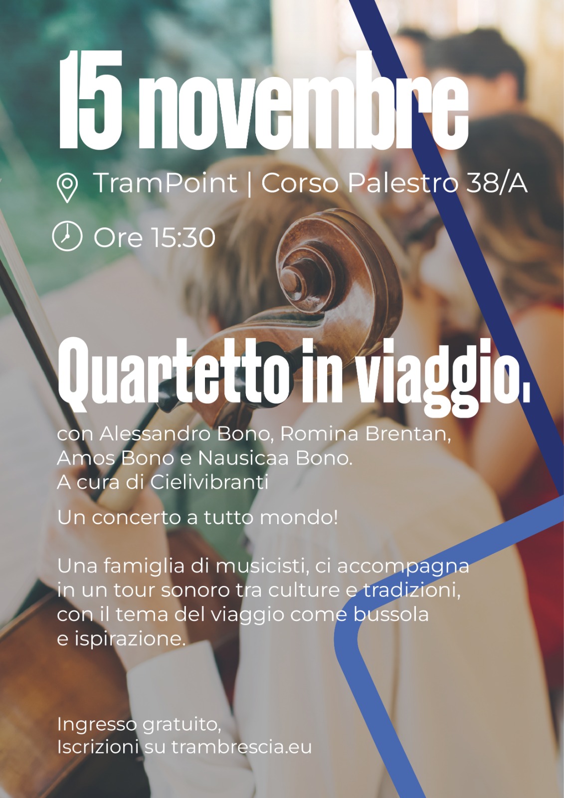 Lo spazio davanti al TramPoint ospiterà "Quartetto in viaggio", il concerto dedicato al tema che ha affascinato artisti di ogni tempo, e i musicisti in particolare: dalle suggestioni dei Grand Tour settecenteschi alle evocazioni di terre lontane, dai canti popolari raccolti lungo percorsi reali fino ai viaggi interiori affidati al linguaggio sinfonico.