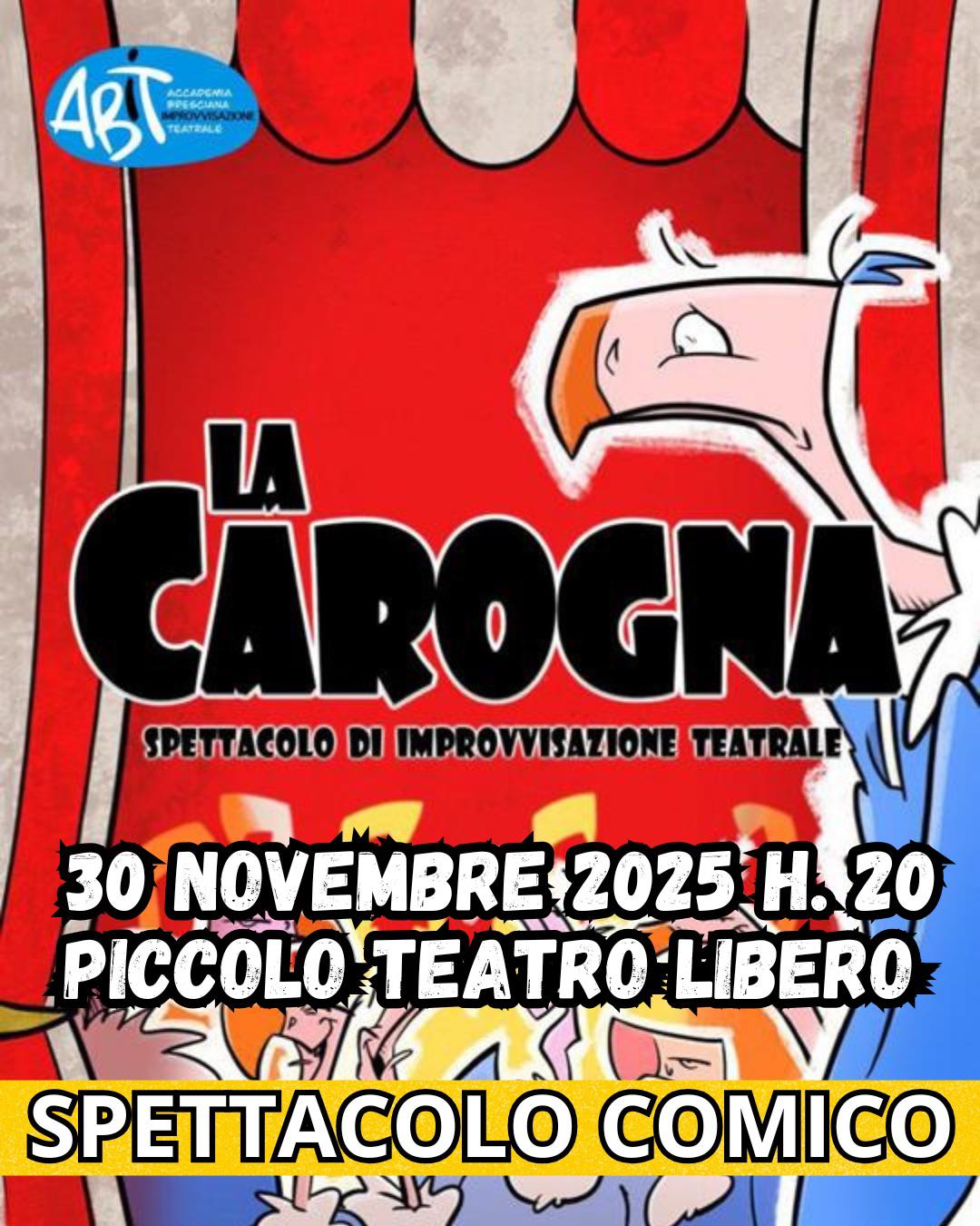 La Carogna si è trovata talmente bene al piccolo teatro libero che ha deciso di riatterrare su di esso. Venite a salutarla !!! Cos'é La Carogna ? É uno spettacolo d'improvvisazione teatrale ad alto contenuto di risate, l'unico spettacolo al mondo che garantisce il soddisfatti o rimborsati. Se non ridete vi rimborsiamo il biglietto!!! E per riuscirci i nostri attori si lanceranno in sfide al limite della legge fisica e a volte di quella morale OSPITE ECCEZIONALE: Leonardo Cagnolati!!!! Vi Aspettiamo!!!