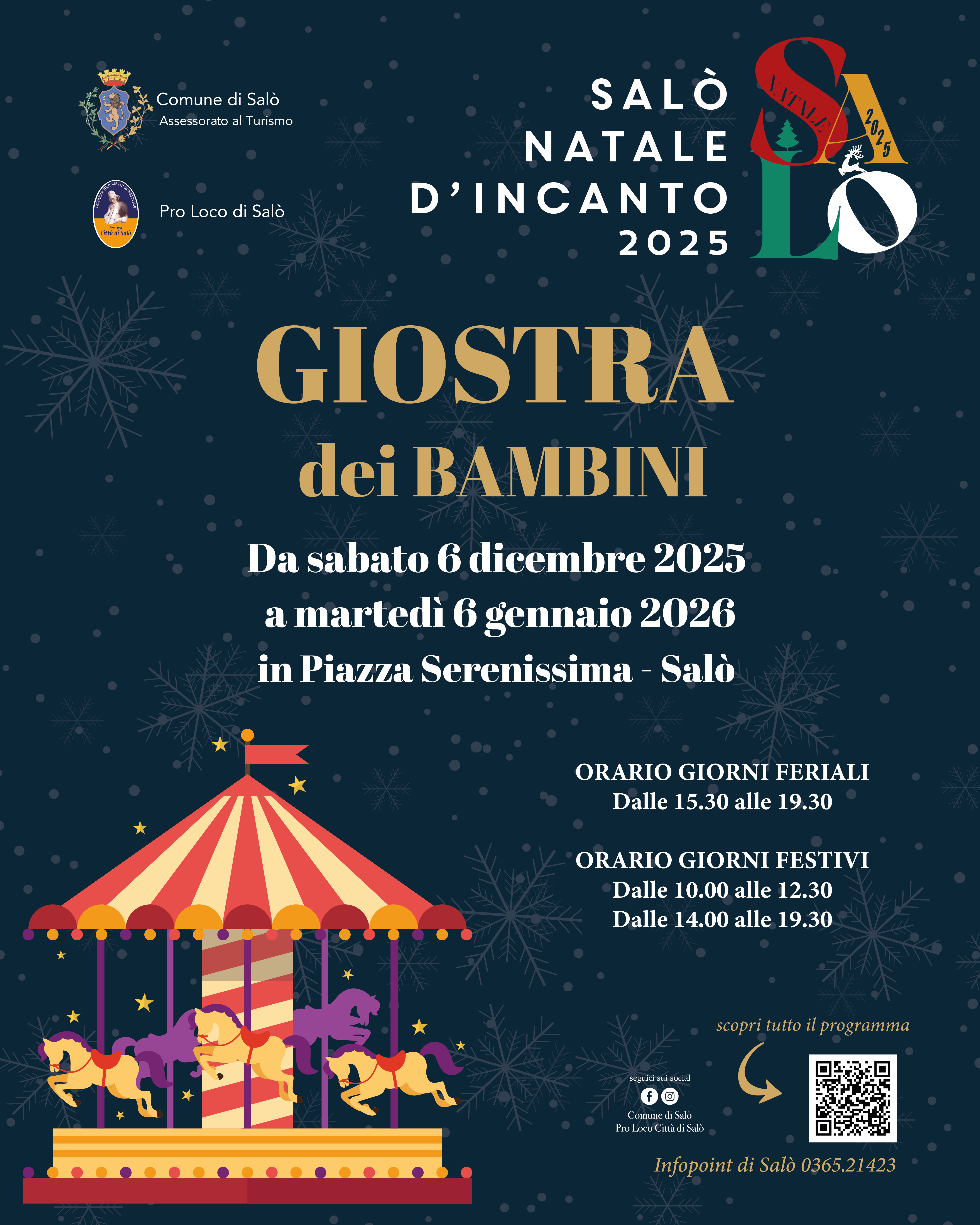 Durante il periodo del “Natale d’Incanto” a Salò, in Piazza Serenissima viene allestita una colorata giostra dedicata ai più piccoli, con cavalcioni tradizionali e un’atmosfera davvero magica.