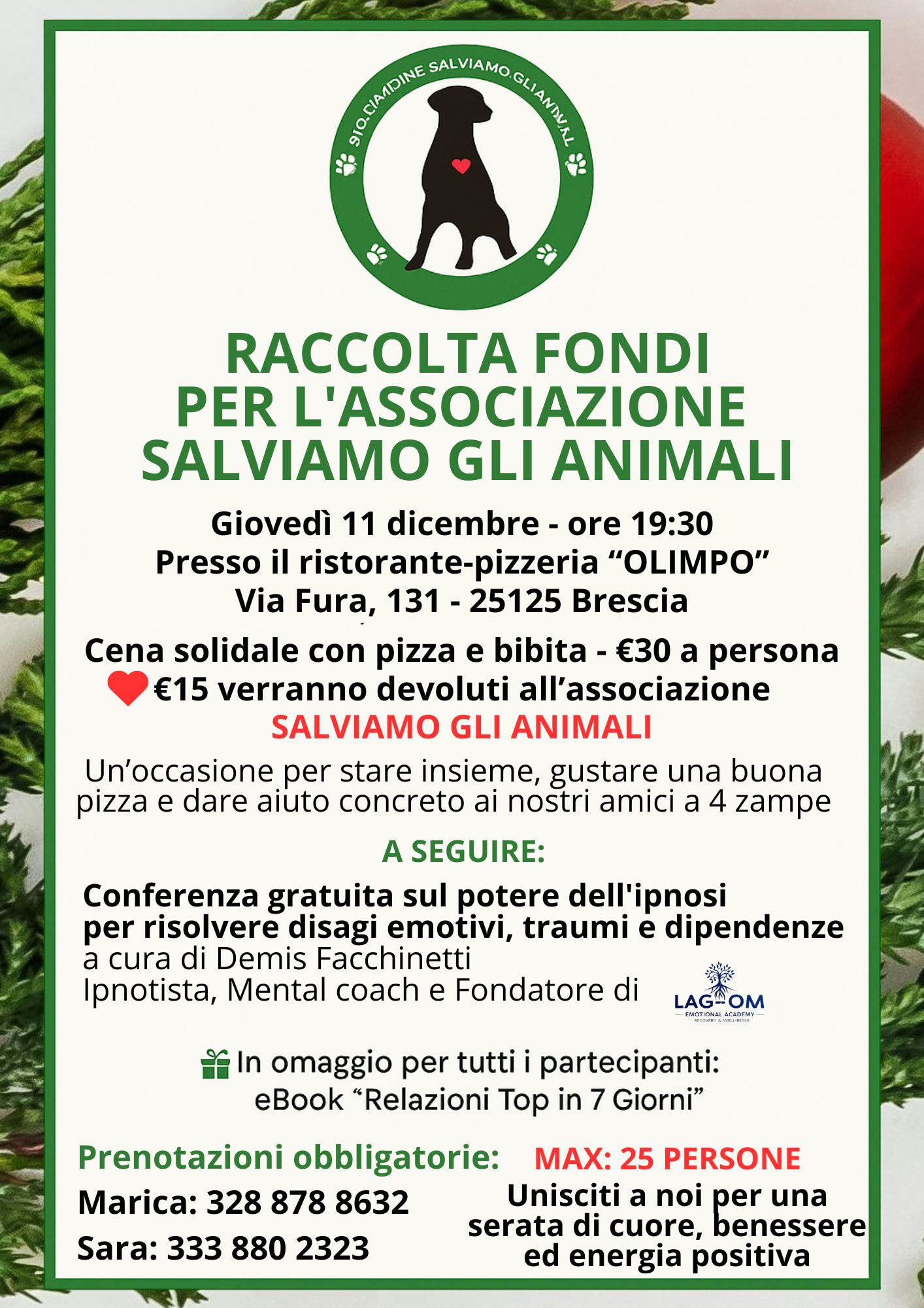 Cena solidale con pizza e bibita e 30 a persona, €15 verranno devoluti all'associazione SALVIAMO GLI ANIMALI Un'occasione per stare insieme, gustare una buona pizza e dare aiuto concreto ai nostri amici a 4 zampe