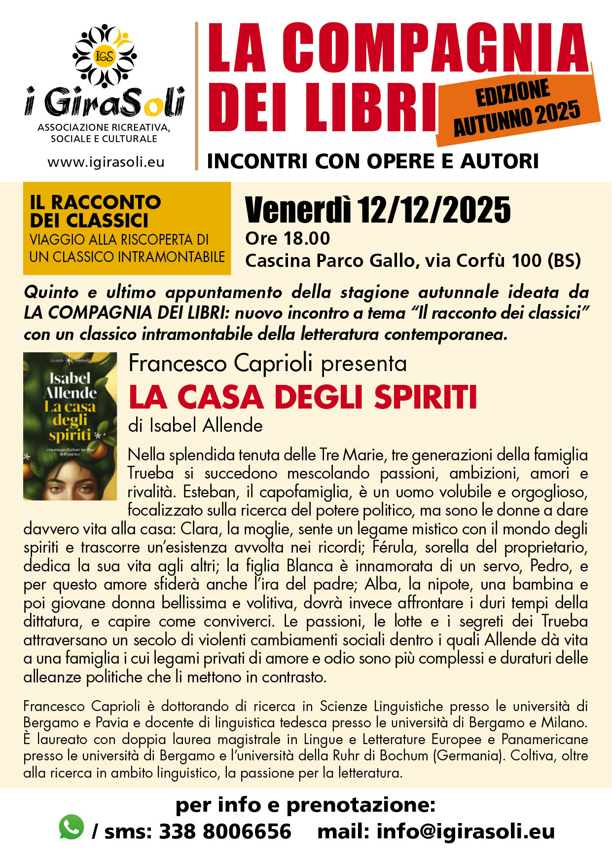 Le passioni, le lotte e i segreti dei Trueba attraversano un secolo di violenti cambiamenti sociali dentro i quali Allende dà vita a una famiglia i cui legami privati di amore e odio sono più complessi e duraturi delle alleanze politiche che li mettono in contrasto. Francesco Caprioli è dottorando di ricerca in Scienze Linguistiche presso le università di Bergamo e Pavia e docente di linguistica tedesca presso le università di Bergamo e Milano. È laureato con doppia laurea magistrale in Lingue e Letterature Europee e Panamericane presso le università di Bergamo e l'università della Ruhr di Bochum (Germania). Coltiva, oltre alla ricerca in ambito linguistico, la passione per la letteratura. Dopo l'evento, omaggio natalizio da parte dell'associazione IGS IGiraSoli.