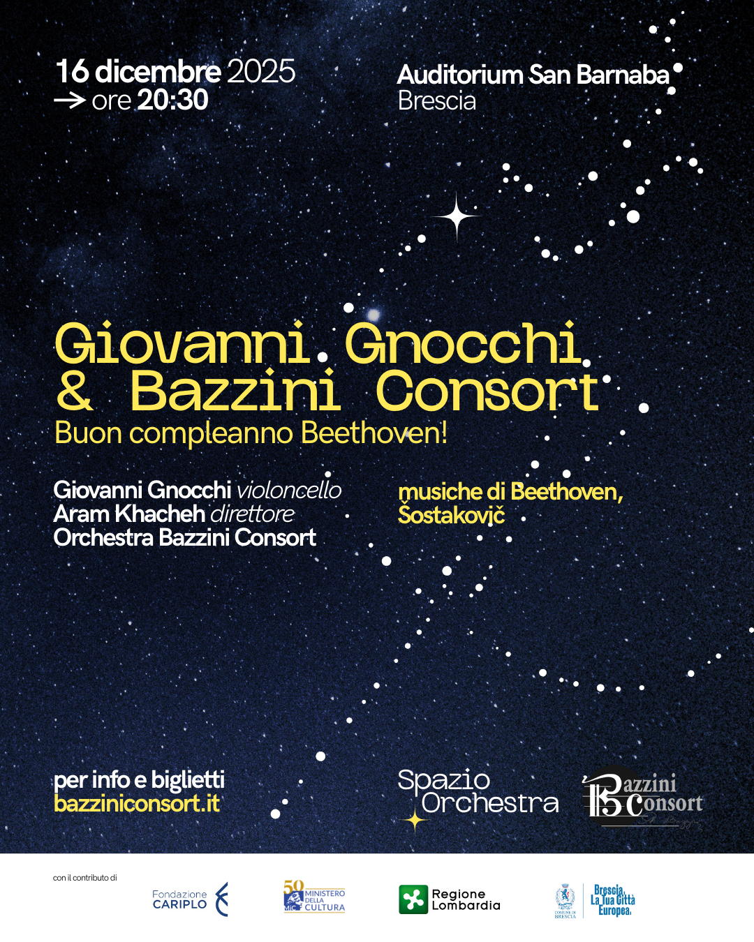 L'Orchestra Bazzini Consort, sotto la direzione del M° Aram Khacheh, sarà la protagonista del concerto Buon Compleanno Beethoven!, un evento che celebrerà l'anniversario della nascita del celebre compositore (nato il 16 dicembre 1770).