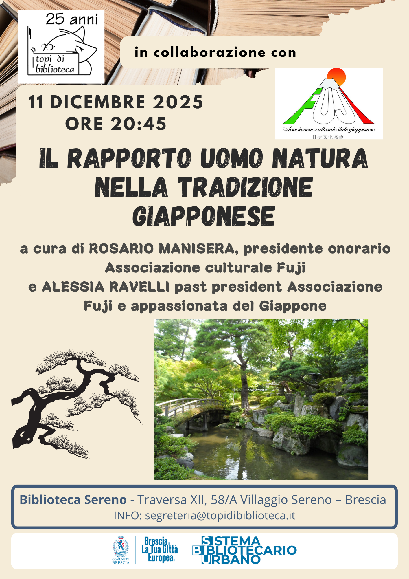 L'Associazione Culturale Topi di biblioteca organizza presso la Biblioteca Sereno del Villaggio Sereno un incontro dal titolo "Il rapporto uomo natura nella tradizione giapponese" con il Prof. Rosario Manisera, Presidente Onorario dell'Associazione culturale Fuji, insignito dal Governo Giapponese nel 2017 della onorificenza "Ordine del Sol Levante, Raggi d'Oro e d'Argento" per l'impegno profuso nella diffusione della cultura giapponese in Italia.