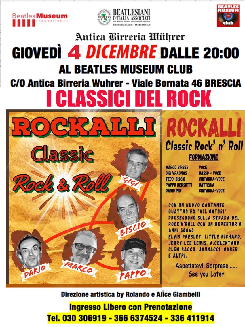 Il gruppo “Rockalli” (ex Alligatori, storico gruppo bresciano), ritornano in concerto al Beatles Museum Club, presso l’Antica Birreria Wuhrer, giovedì 4 dicembre, con un nuovo cantante i quattro ex ALLIGATORI proseguono sulla strada del rock ‘n roll, con un repertorio anni ‘50-’60 -Elvis Presley, Little Richard, Jerry Lee Lewis, A. Celentano, Clem Sacco, Jannacci , Gaber ed altri.