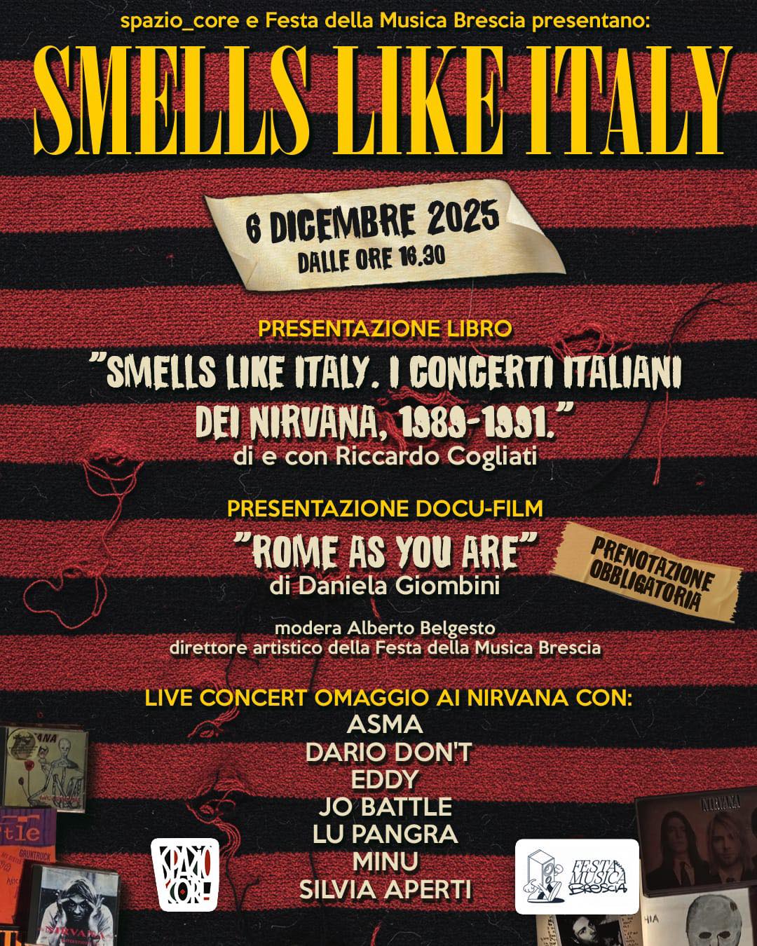La serata si aprirà con la presentazione del libro “SMELLS LIKE ITALY” di Riccardo Cogliati, che sarà presente per dialogare con il pubblico e raccontare la genesi del volume, un viaggio nelle influenze, negli aneddoti e nelle testimonianze italiane legate alla storia dei Nirvana.