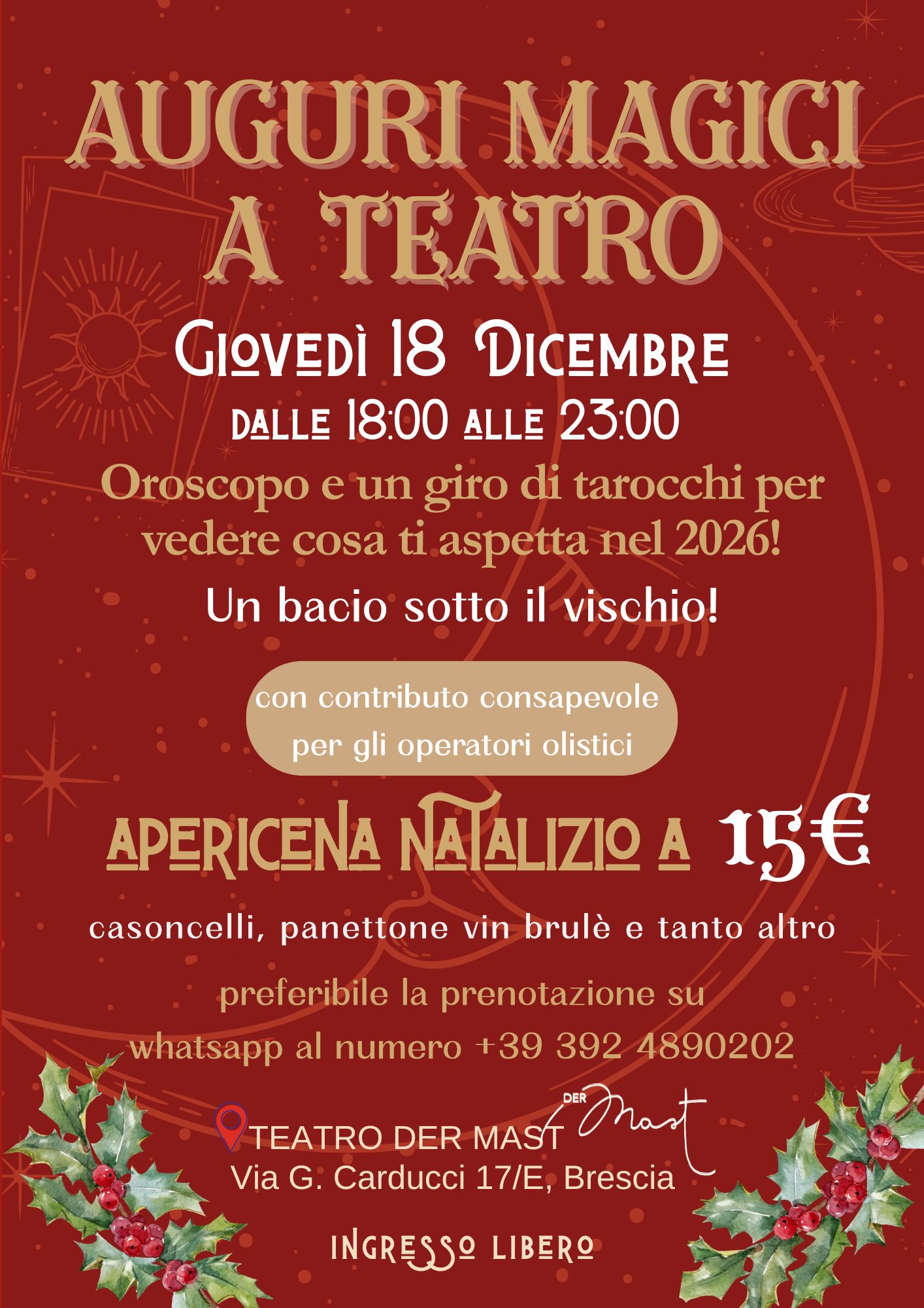 Alchimia APS torna al Teatro Der Mast (via Carducci 17/E - Brescia) e apre le porte a "Auguri Magici a Teatro": una serata dove stelle, tarocchi e brindisi saranno protagonisti. Il 2026 ci osserva da dietro l'angolo… e noi lo affrontiamo con transiti favorevoli, arcani illuminanti e un pizzico di ironia! Ad accoglierci ci saranno astrologi e tarologi, pronti a raccontarci cosa ci riservano i pianeti (e magari anche cosa Mercurio ha deciso di combinare stavolta). Ingresso libero, con contributo consapevole per gli operatori.