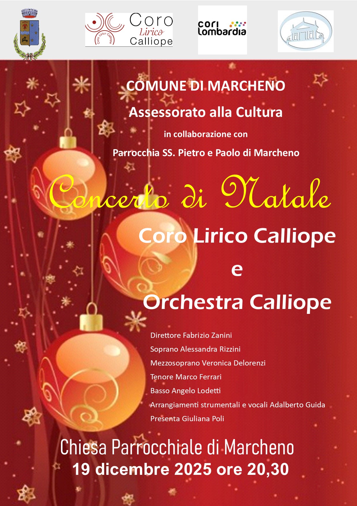 Il Coro Calliope si esibirà per il Concerto di Natale. Come ormai consuetudine, oltre alla partecipazione dell'Orchestra Calliope, si produrranno alcuni solisti: Alessandra Rizzini (soprano), Veronica Delorenzi (mezzosoprano), Marco Ferrari (tenore), Angelo Lodetti (basso).