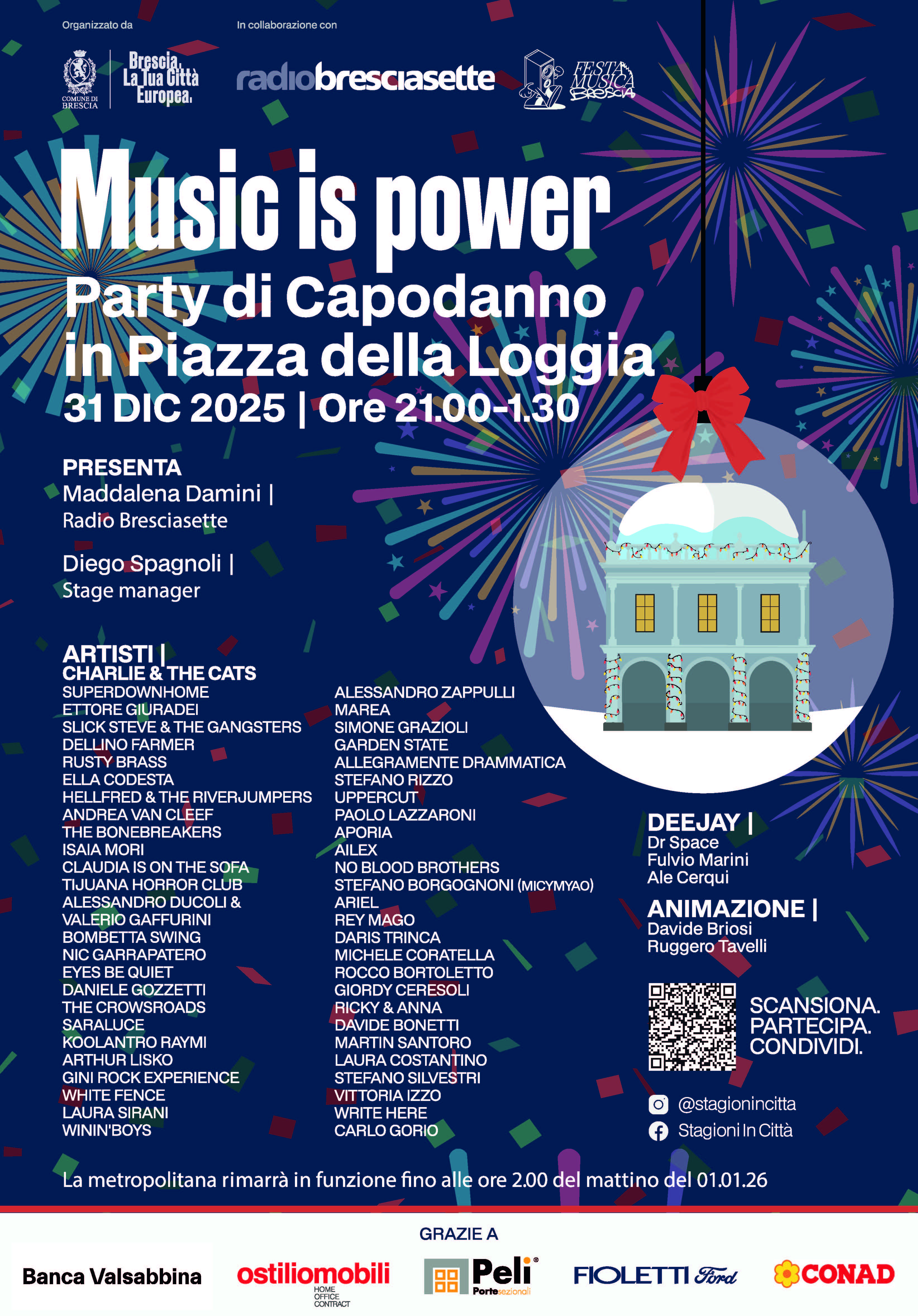 La formula di “Music Is Power” è un party tutto made in Brescia, che coinvolgerà i talenti e la creatività di casa valorizzando il patrimonio artistico locale e trasformando il Capodanno in un momento di grande condivisione.