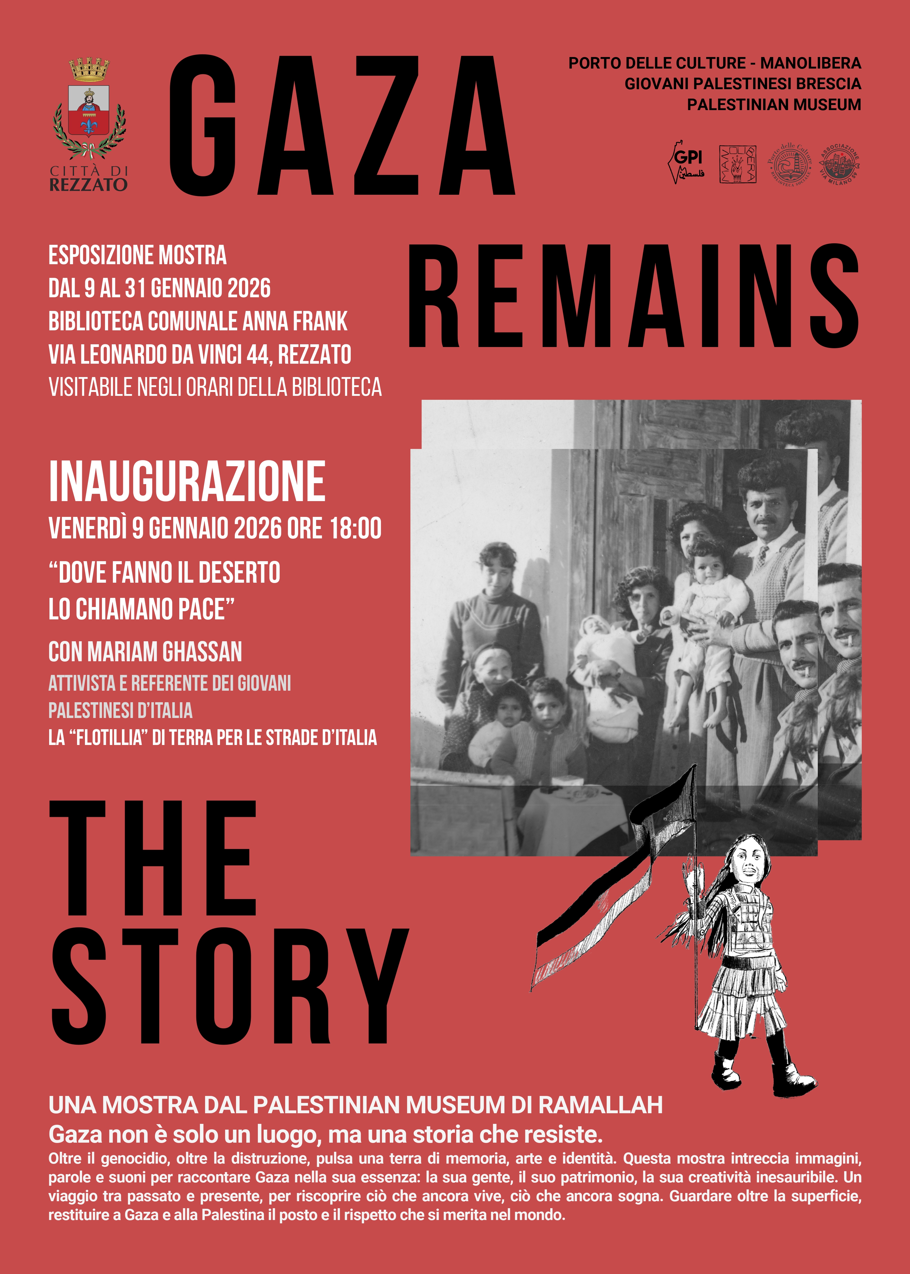 In occasione dell'iniziativa "Rezzato per la Pace", la Biblioteca Comunale Anna Frank ospita dal 9 al 31 gennaio 2026 la mostra "Gaza Remains".