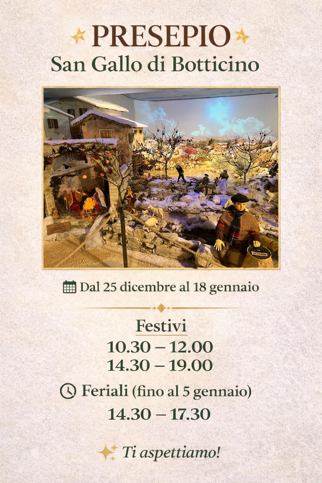 41esima edizione del Presepio tradizionale dell'oratorio di San Gallo. La Natività è proposta in un'ambientazione umile, nel quale la natura è protagonista e la presenza dell'uomo è posta ai margini, rispettosa. Nell'alternarsi del giorno e della notte, con il tempo scandito dai dialoghi e dalla laboriosità di personaggi in movimento, il visitatore viene condotto nel cuore del presepe, divenendo esso stesso parte del medesimo.