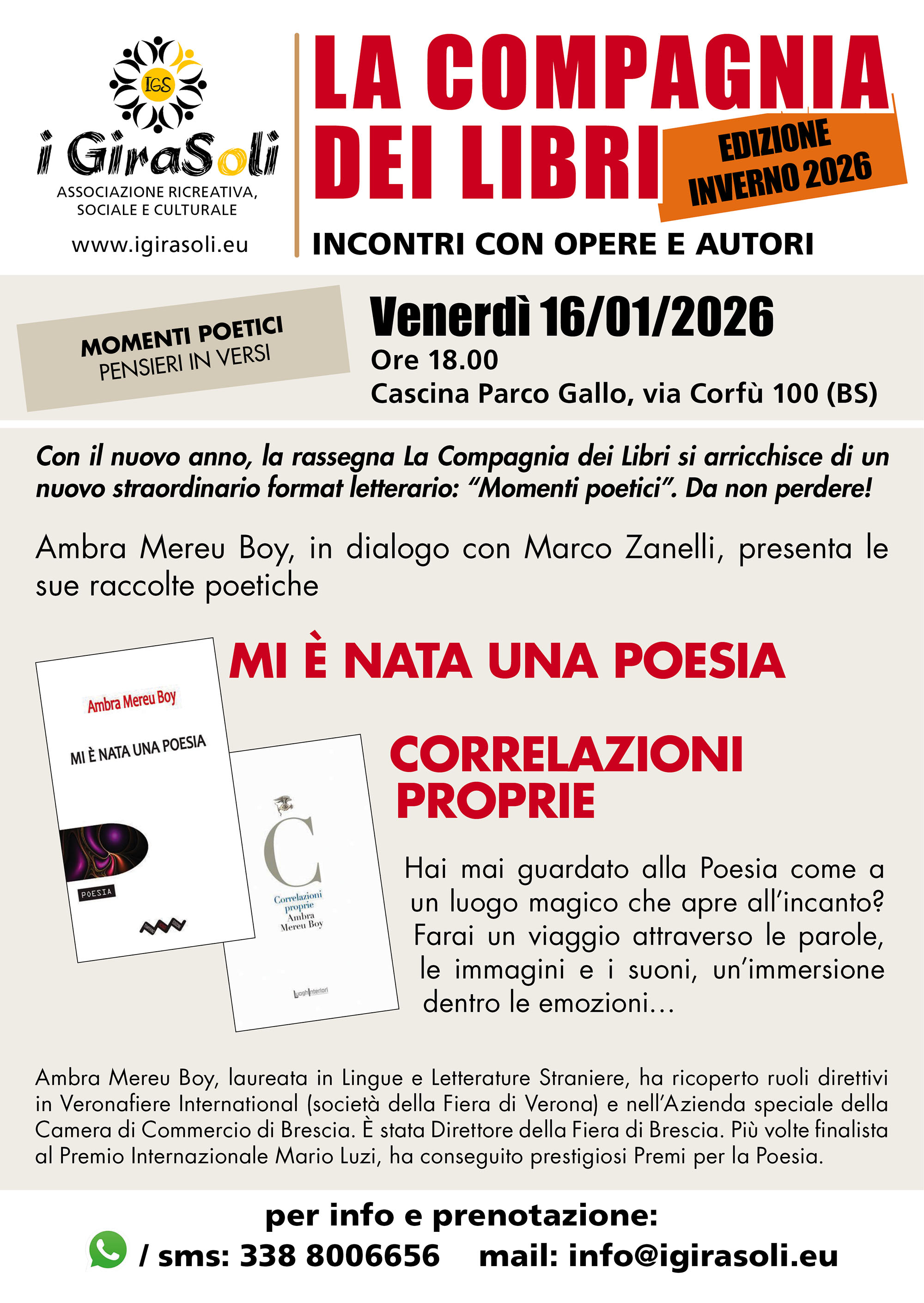 Per l'associazione IGiraSoli presenterà entrambe le sue raccolte poetiche, "Mi è nata una poesia" e "Correlazioni proprie"