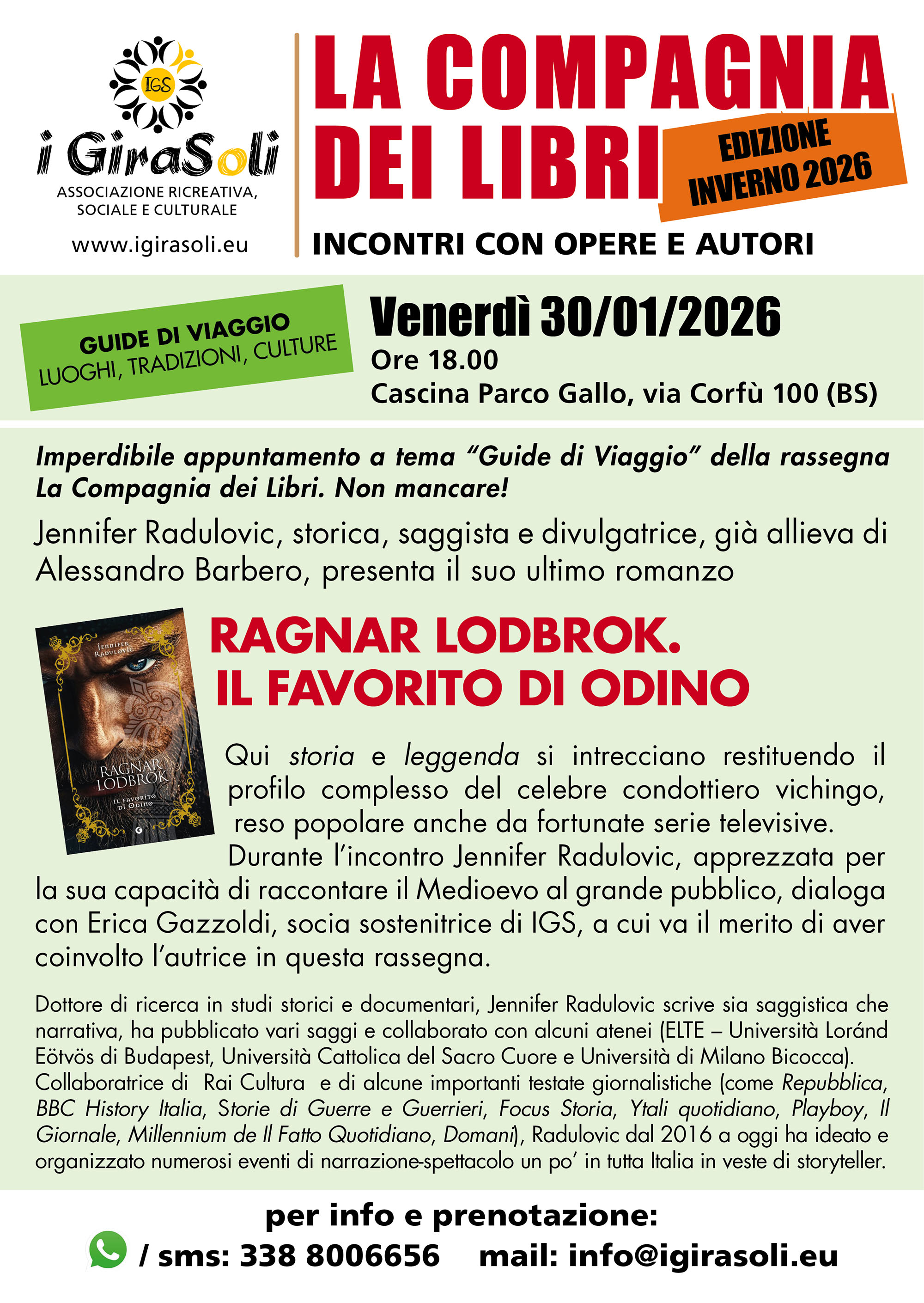 Per questo terzo appuntamento della stagione invernale de La Compagnia Dei Libri, l'associazione IGiraSoli ha il piacere di proporre l'incontro con Jennifer Radulovic, storica, saggista, divulgatrice, già allieva di Alessandro Barbero, ma anche collaboratrice di vari atenei italiani e internazionali, di RaiCultura e alcune importanti testate giornalistiche.