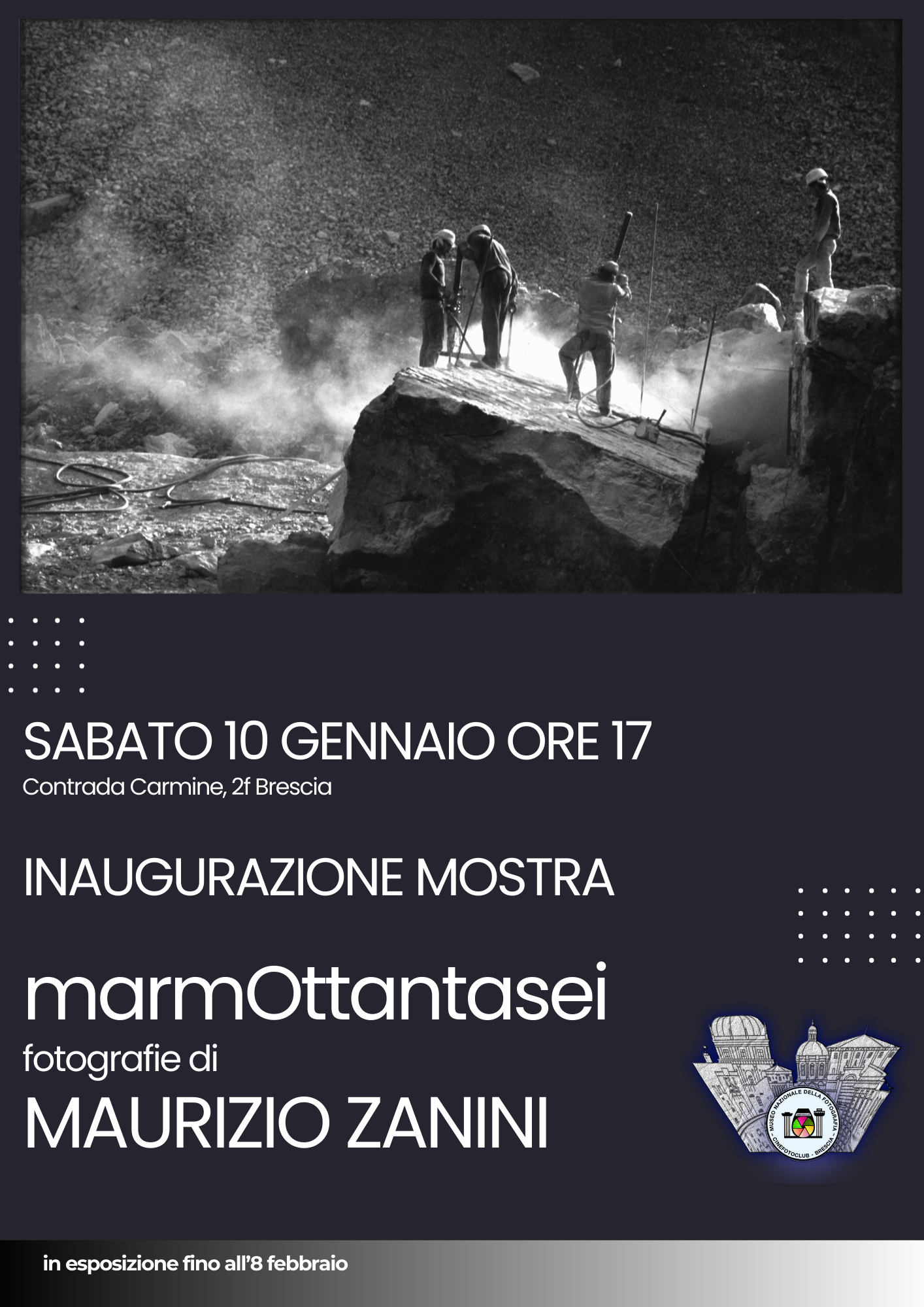 Questa serie di scatti “marmOttantasei” realizzati nella seconda metà degli anni ‘80 nelle cave di Botticino e Virle testimonia con la sobria partecipazione di un bianco e nero senza forzature drammatiche dei toni la realtà e la dignità di un duro lavoro.