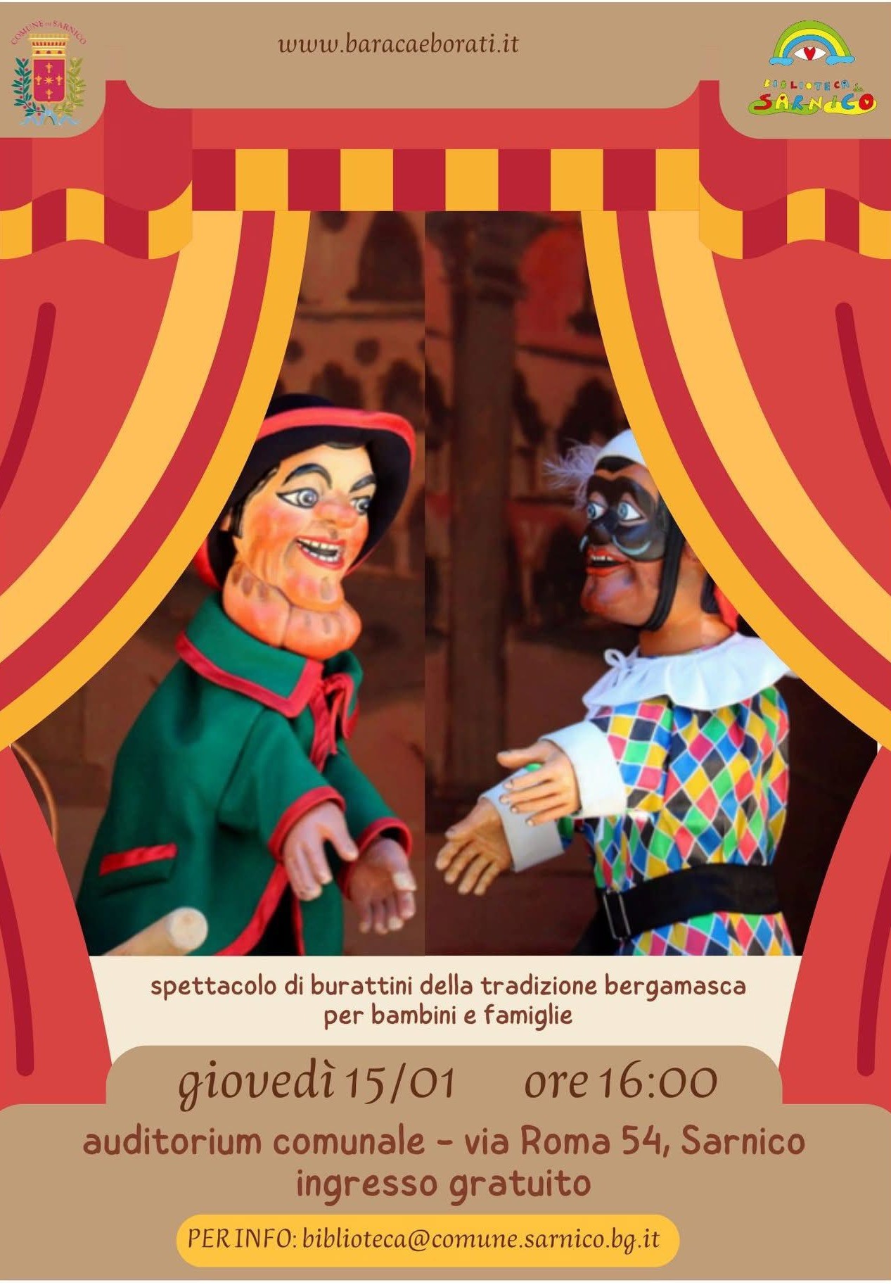Spettacolo di burattini della tradizione bergamasca, dedicato a bambini e famiglie, a cura della compagnia Baraca & Böratì.