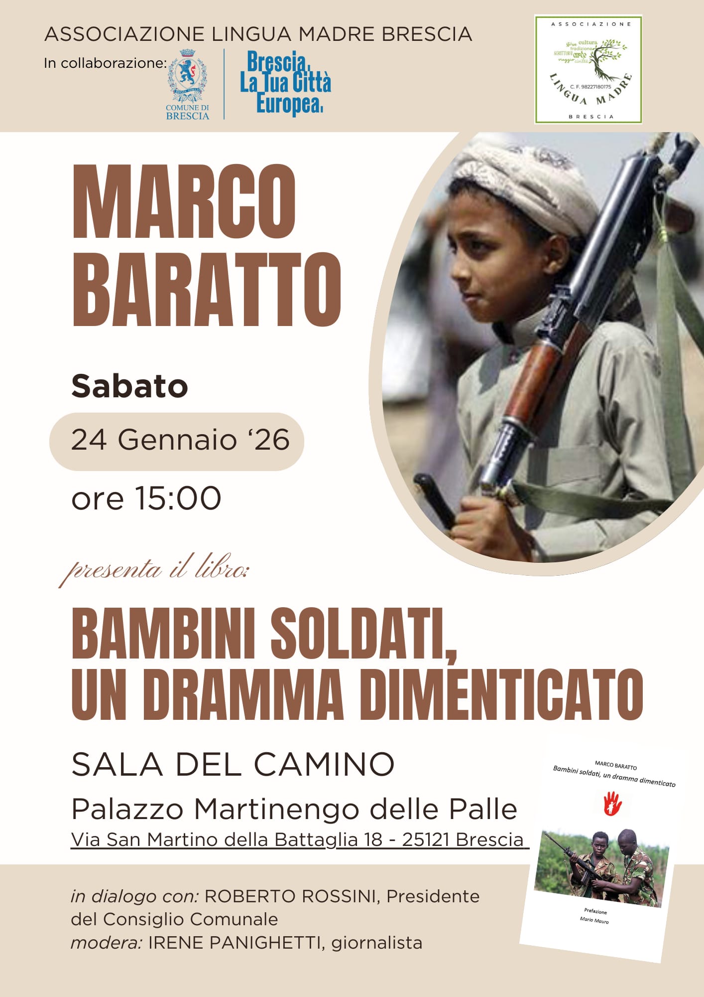 Un incontro pubblico dedicato al tema dei bambini soldato, una delle più gravi e dimenticate violazioni dei diritti umani. A partire dal libro "Bambini soldati, un dramma dimenticato" di Marco Baratto, si rifletterà sulle responsabilità globali e sul ruolo delle istituzioni e delle comunità locali.