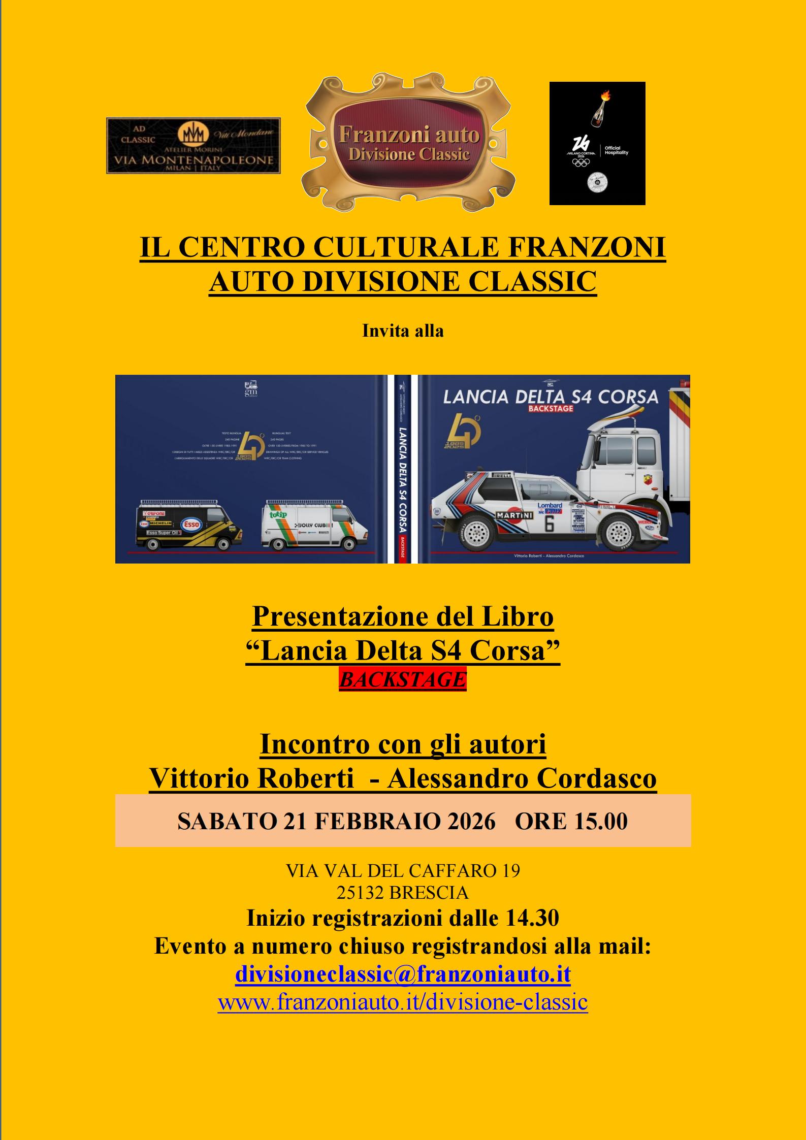 Primo Evento 2026 del Centro Culturale Franzoni Auto Divisione Classic Lancia Delta S4 Corsa 40° anniversario & Backstage