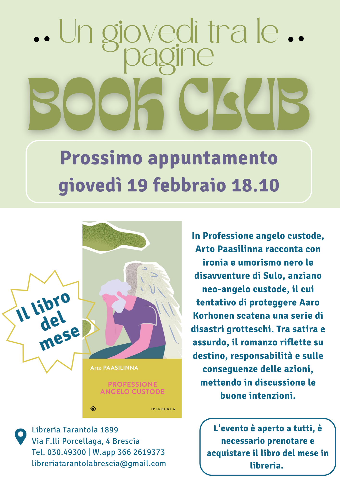È richiesta la prenotazione all'indirizzo: libreriatarantolabrescia@gmail.com e l’acquisto del libro del mese presso la libreria.
