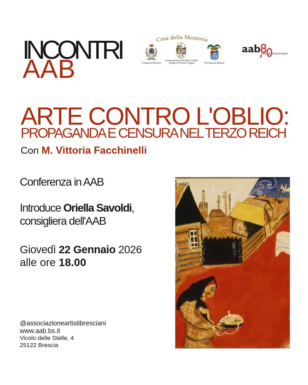 Nell’ambito delle iniziative legate alla Giornata della Memoria, si terrà la conferenza “Arte contro l’oblio: propaganda e censura nel Terzo Reich” a cura della storica dell’arte Maria Vittoria Facchinelli.
