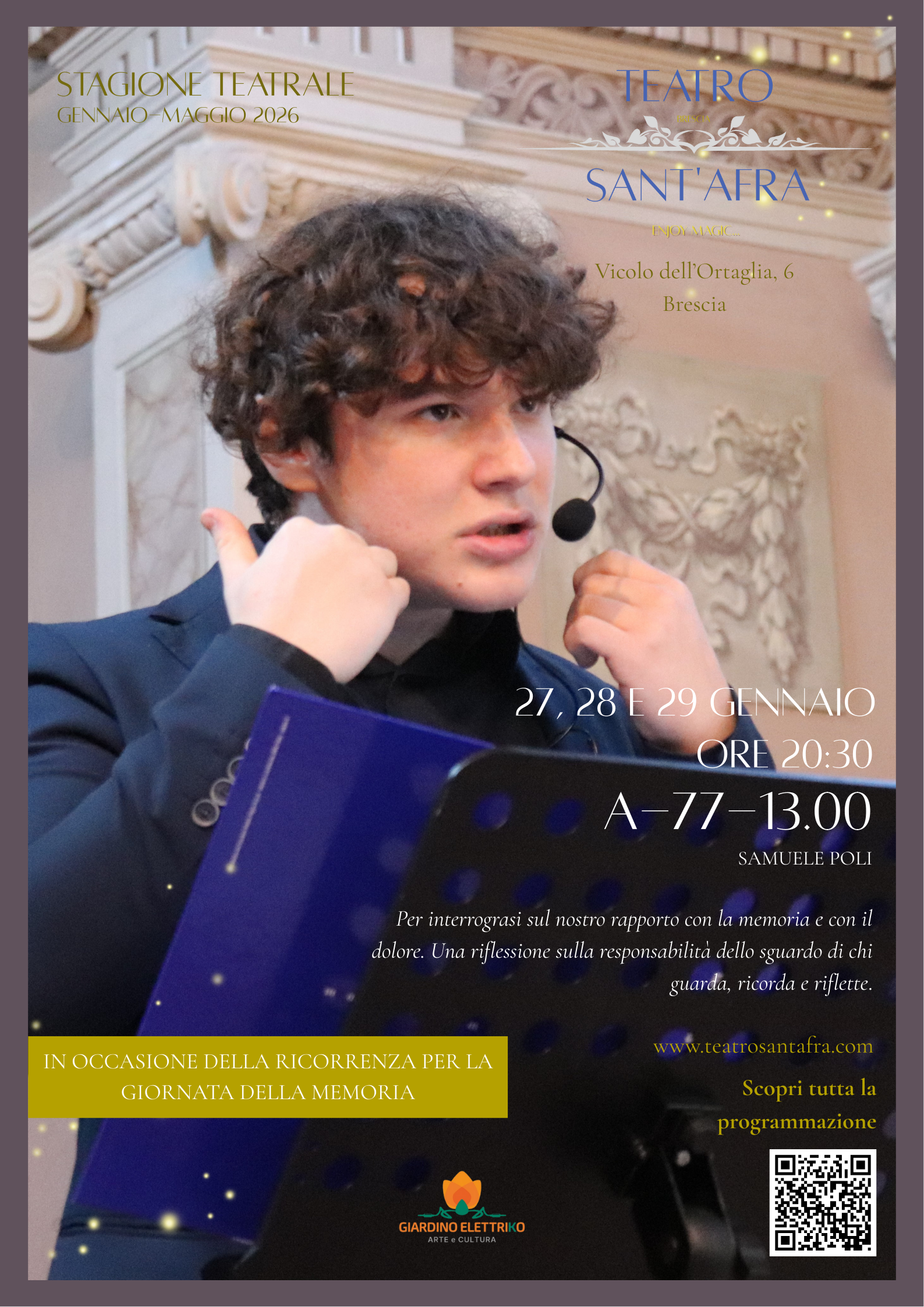 Samuele Poli, classe 2006, è un giovane autore e interprete bresciano che da 3 anni propone sul territorio, tra scuole e associazioni culturali, lo spettacolo A-7713.
