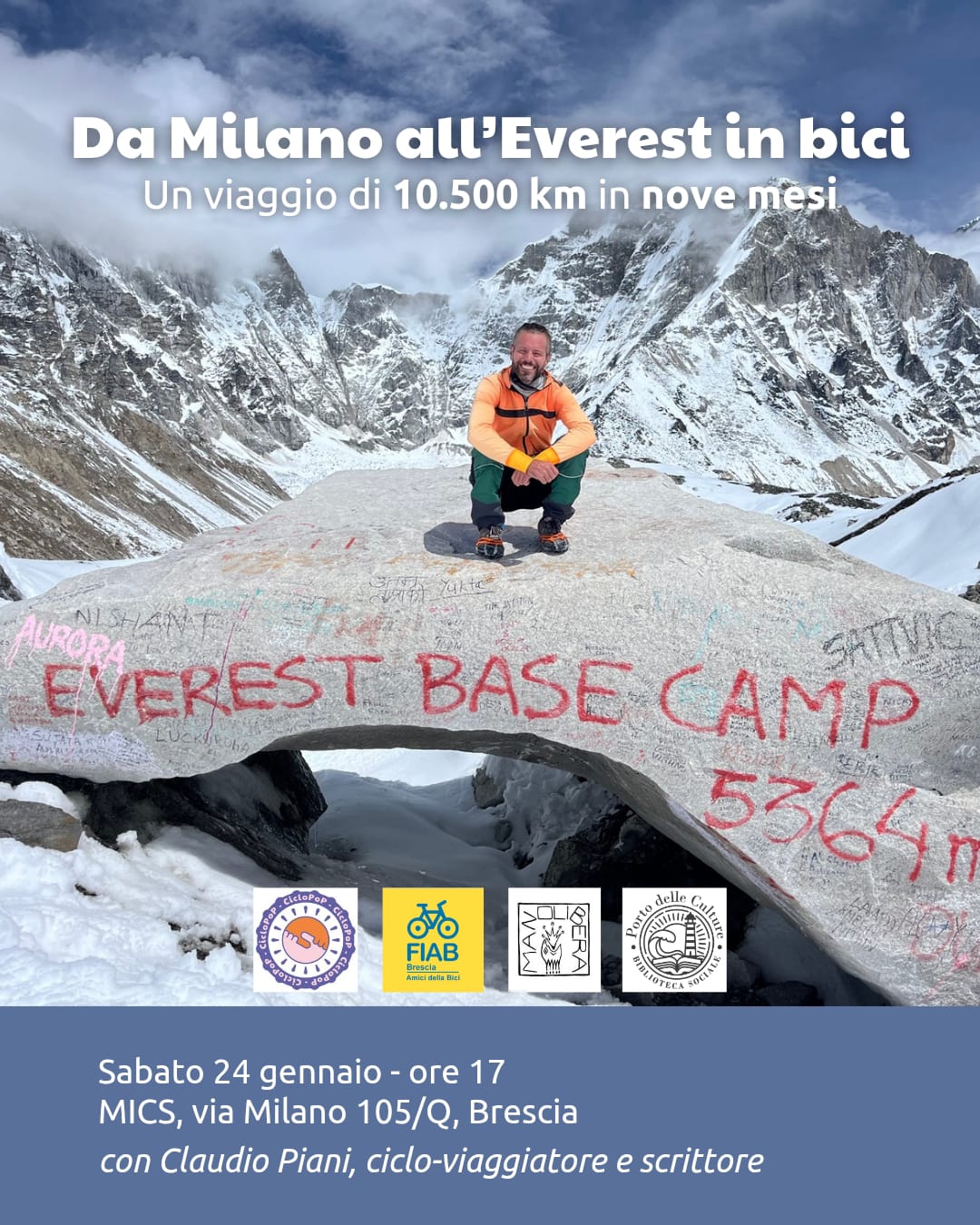 Sarà ospite Carlo Piani (ciclo-viaggiatore e scrittore) che racconterà della sua avventura su due ruote, dallo zerbino di casa fino al campo base della montagna più alta del mondo.