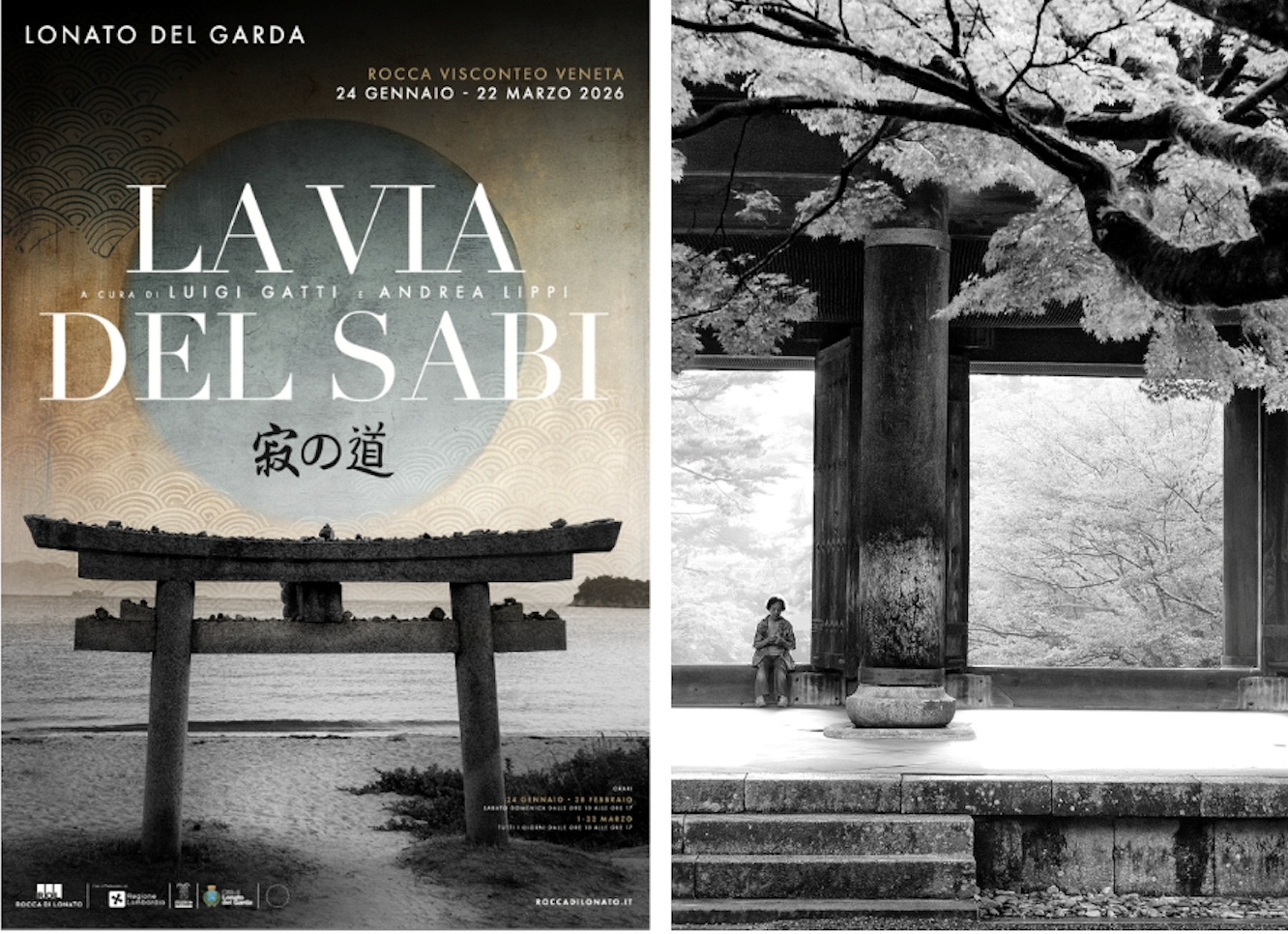 Fortezza imponente e insieme sorprendentemente accogliente, la Rocca di Lonato è uno spazio dove il tempo sembra rallentare, lasciando spazio all'ascolto, alla contemplazione, allo sguardo. È qui, tra pietre segnate, camminamenti di guardia e sale cariche di memoria, che il concetto di sabi - bellezza segnata dal tempo e dall'usura - trova una risonanza naturale. La mostra nasce dal dialogo tra le fotografie di Andrea Lippi e le parole e gli ideogrammi interpretati da Luigi Gatti, ed è legata all'omonimo volume pubblicato da Folia Edizioni. Al centro del percorso non c'è un racconto del Giappone, ma un viaggio interiore: immagini e segni costruiscono una "via" fatta di vuoti, pause e presenze lievi, dove la fotografia non afferma ma suggerisce, e la parola non spiega ma accompagna. Le fotografie di Andrea Lippi sono il risultato di un lungo progetto di studio sulla luce negli ambienti e nei paesaggi giapponesi. Dopo il primo viaggio in Giappone nel 2015, l'autore avvia un percorso di ricerca che lo porta a tornare più volte nel Paese, dando vita nel 2017 al progetto Lights of Japan, presentato in numerose mostre in Italia e all'estero. Nel 2024 il lavoro riceve due menzioni d'onore ai premi internazionali TIFA e BIFA e viene esposto in una mostra dedicata alla fotografia contemporanea in bianco e nero a Portland, negli Stati Uniti. Studioso ed esperto di cultura giapponese, autore, divulgatore e guida, Luigi Gatti ha vissuto un lungo percorso professionale tra Italia, Spagna e Giappone, maturando una profonda sensibilità per l'incontro tra culture. Da sempre appassionato di viaggi lenti, ha percorso a piedi le principali Vie per Santiago di Compostela, facendo del cammino uno strumento d'introspezione e apertura verso l'altro. In Giappone ha affrontato il Cammino di Shikoku: un pellegrinaggio millenario di 1.200 km attraverso gli 88 templi del Buddhismo Shingon. Da questa esperienza è nato il suo libro "Il cammino del Giappone. Shikoku e gli 88 templi" (Mursia). Oggi si dedica a diffondere la conoscenza della lingua e della cultura giapponese attraverso incontri sul territorio e i canali digitali. Ad accogliere questo dialogo tra immagini e ideogrammi è un luogo che da secoli custodisce e rinnova il rapporto tra storia e contemporaneità. Dalle mura merlate che dominano il Lago di Garda alle sale decorate della Casa del Podestà, il complesso monumentale della Rocca di Lonato racconta secoli di arte, memoria e bellezza viva grazie all'opera della Fondazione Ugo Da Como, punto di riferimento per la valorizzazione della storia bresciana e del XIX secolo, nonché parte della Rete dell'800 lombardo.