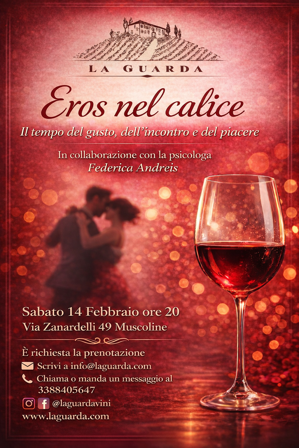 Durante circa 2 ore, tra vino, cibo e musica, scopriremo l'eros come energia vitale, incontro e piacere, in un clima conviviale e leggero.