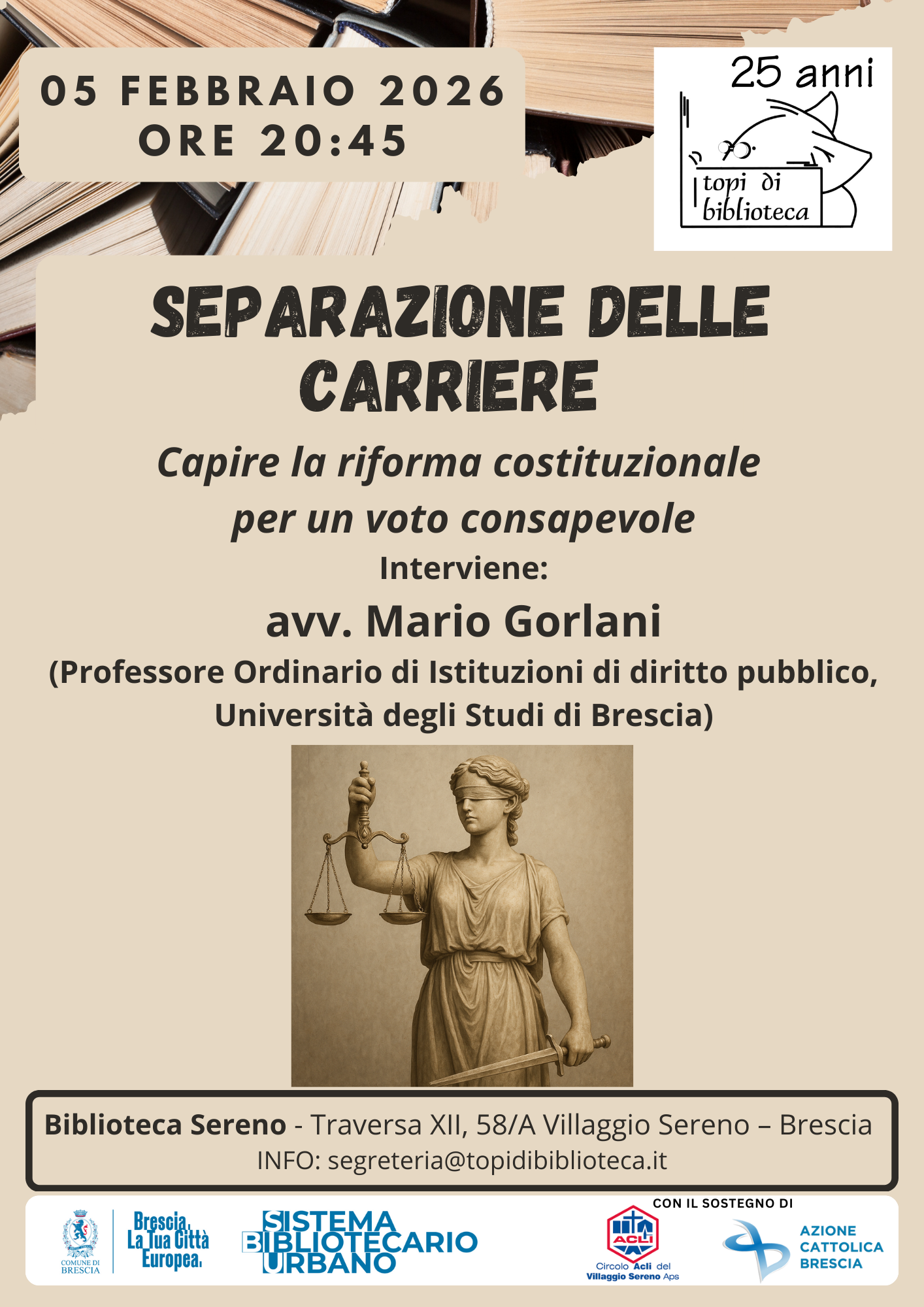 L'Associazione culturale "Topi di biblioteca ODV" promuove un incontro di approfondimento sulla separazione delle carriere nella magistratura e la riforma costituzionale della giustizia, dal titolo "Separazione delle carriere. Capire la riforma costituzionale per un voto consapevole".