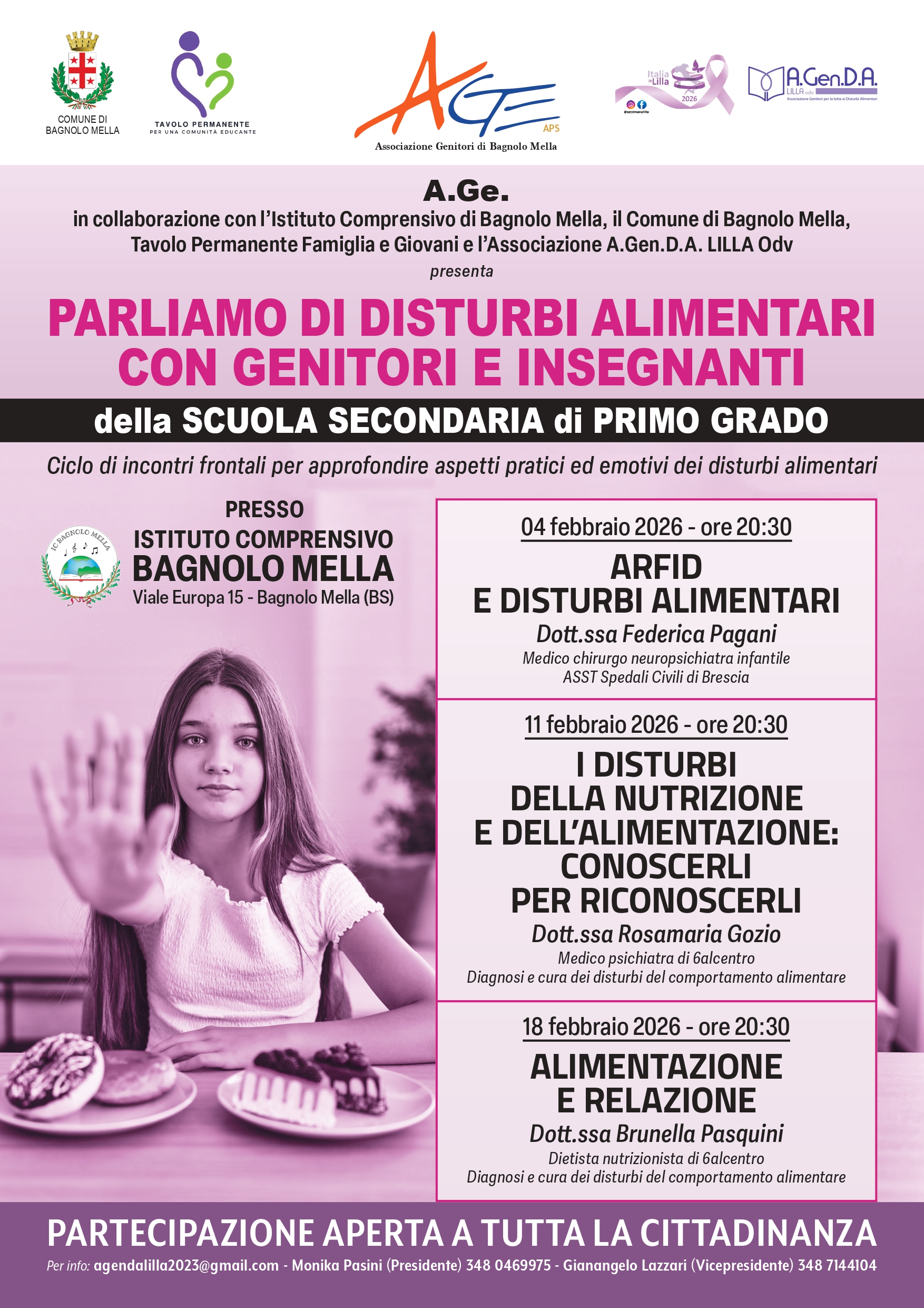 Proprio per questo nasce il ciclo di incontri "Parliamo di disturbi alimentari con genitori e insegnanti della scuola secondaria di primo grado", promosso dall'A.G.E. - Associazione Genitori di Bagnolo Mella in collaborazione con l'Istituto Comprensivo di Bagnolo Mella, il Comune di Bagnolo Mella, il Tavolo Permanente Famiglia e Giovani e l'A.Gen. D.A. Lilla Associazione Genitori per la Lotta ai Disturbi Alimentari.