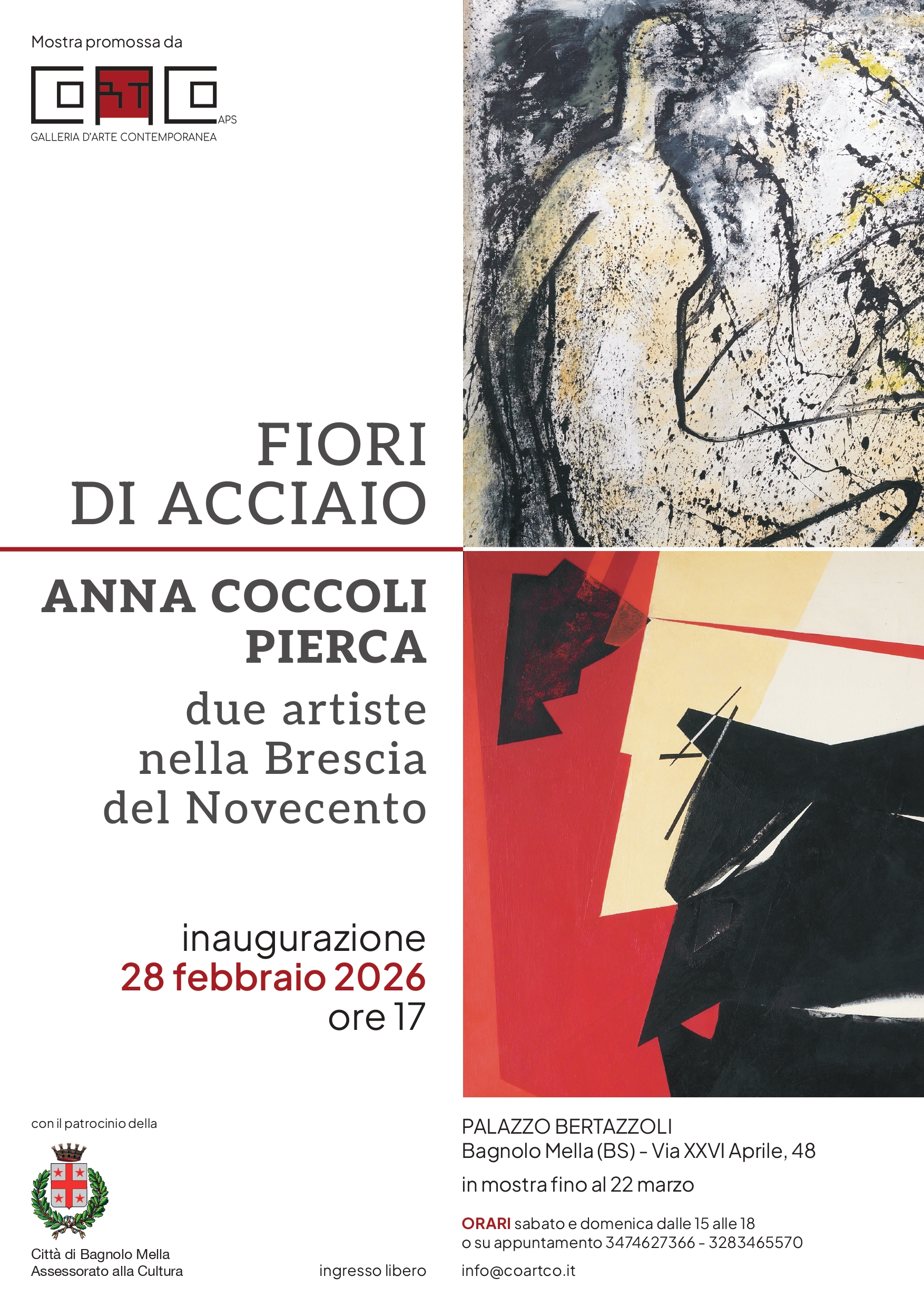 Due grandi interpreti bresciane della pittura del Novecento saranno al centro dell'attenzione con la mostra Fiori di Acciaio - Anna Coccoli e Pierca, in programma dal 28 febbraio al 22 marzo 2026 nella Galleria di Palazzo Bertazzoli.
