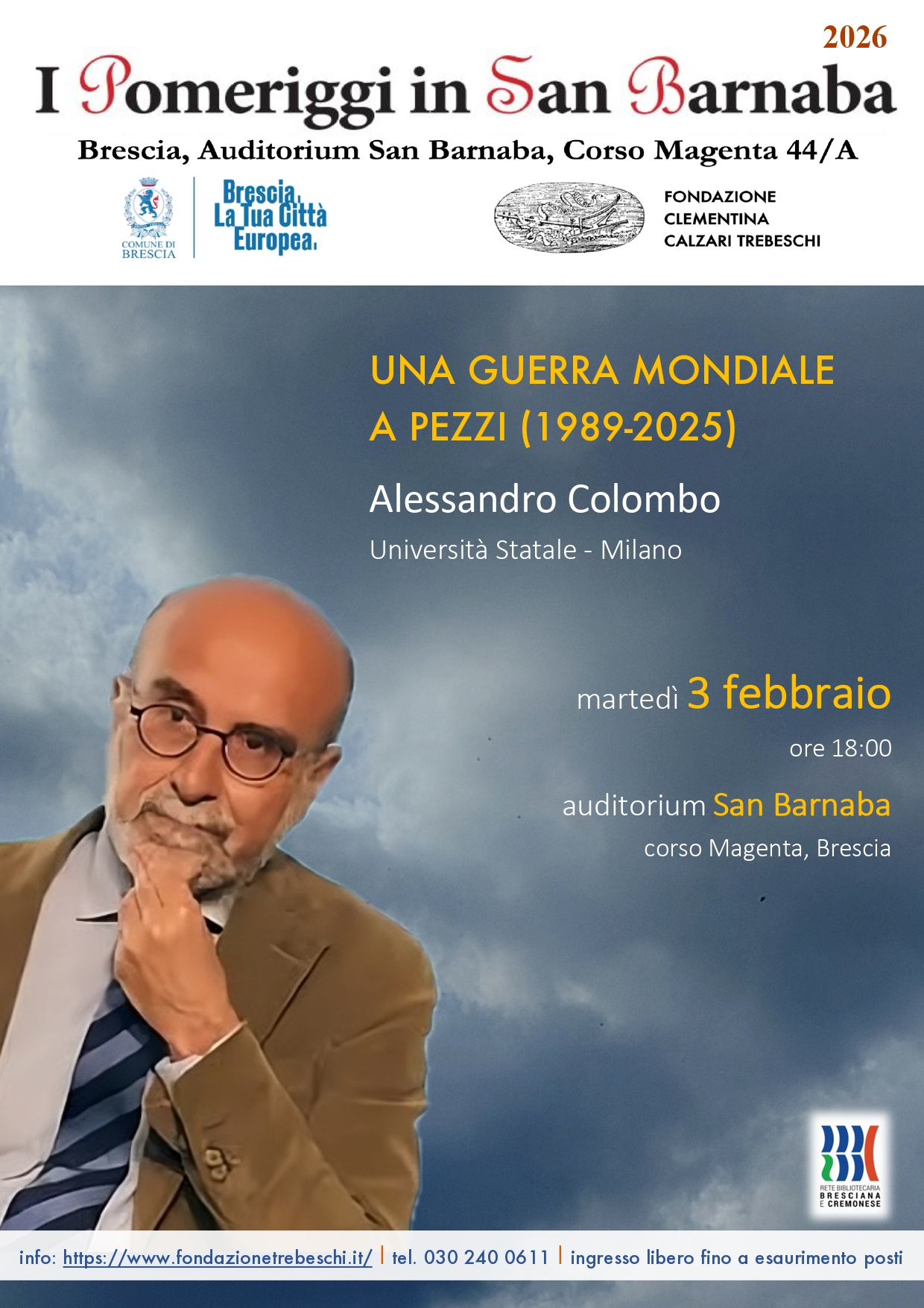 L'incontro è il primo appuntamento dei Pomeriggi in S. Barnaba 2026, ciclo promosso dal Comune di Brescia e dalla Fondazione Clementina Calzari Trebeschi, che ha come tema "Un Mondo Fuori Controllo. Prospettive Sul Disordine Globale".