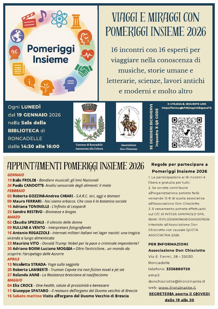 L’Associazione “Don Chisciotte”, in collaborazione con la Biblioteca Comunale e l’Assessorato alla Cultura del Comune di Roncadelle (BS), propone la rassegna di incontri di "POMERIGGI INSIEME".