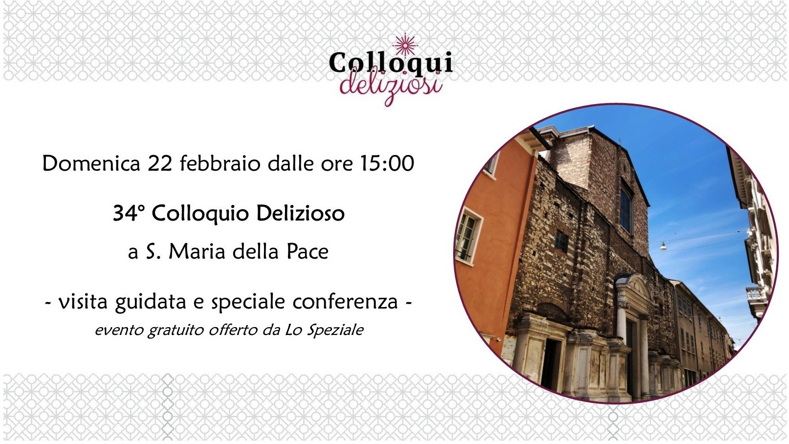 Inizieremo con la visita guidata a cura di Luca Bressanini di BresciaStory. Seguirà una piacevole conferenza a cura di Padre Tiziano Sterli, Preposito della Comunità dell'Oratorio, che ci racconterà la storia tutta bresciana dei "Padri della Pace". Ingresso libero e gratuito, evento offerto da Lo Speziale.