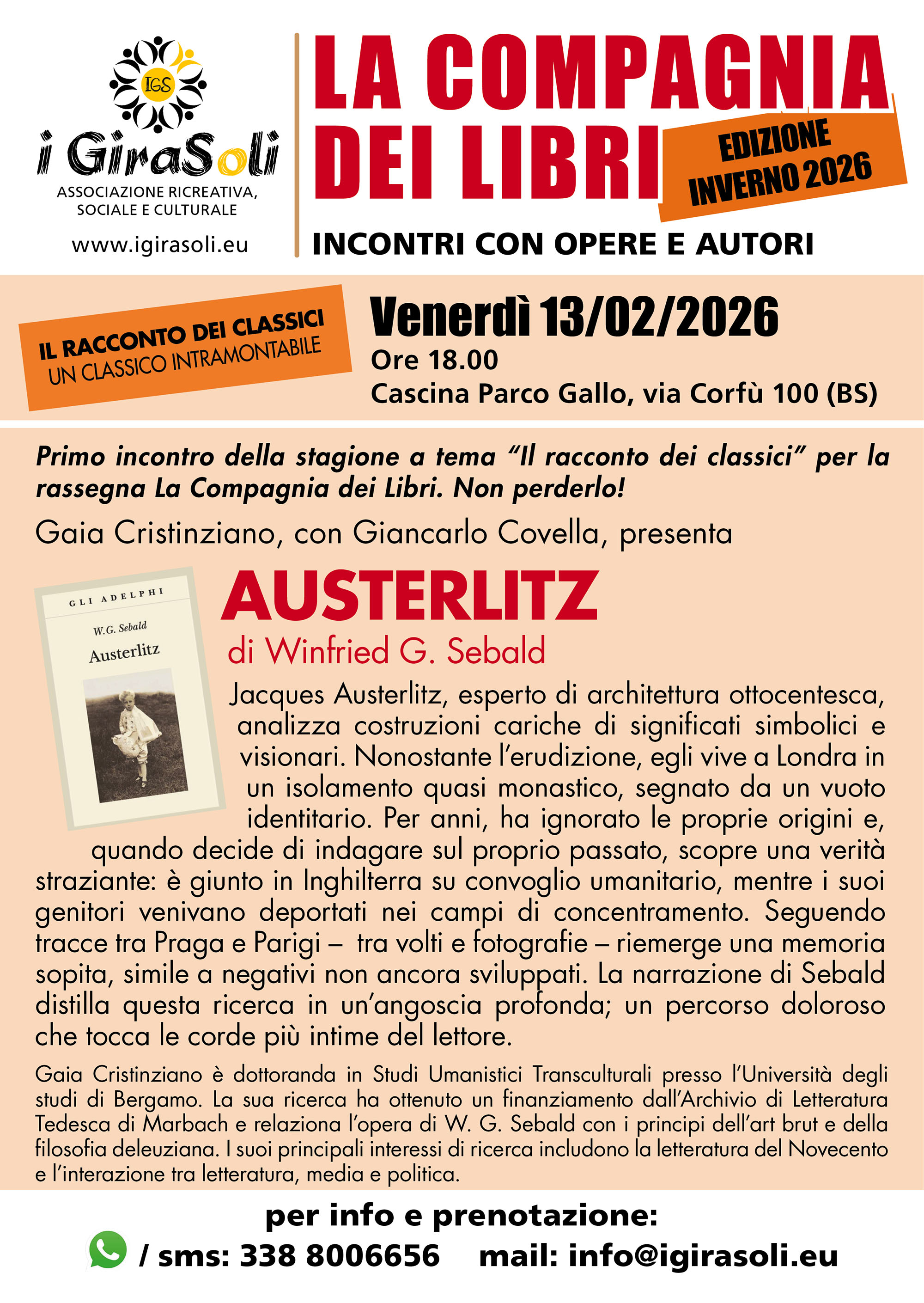 Tornano i "classici" della letteratura al Parco Gallo, nell'ambito de La Compagnia Dei Libri, progetto culturale dell'Associazione IGS I Gira Soli di Brescia, patrocinato dal Comune di Brescia. Verrà in questa occasione proposto il romanzo di W.G. Sebald, "Austerlitz".