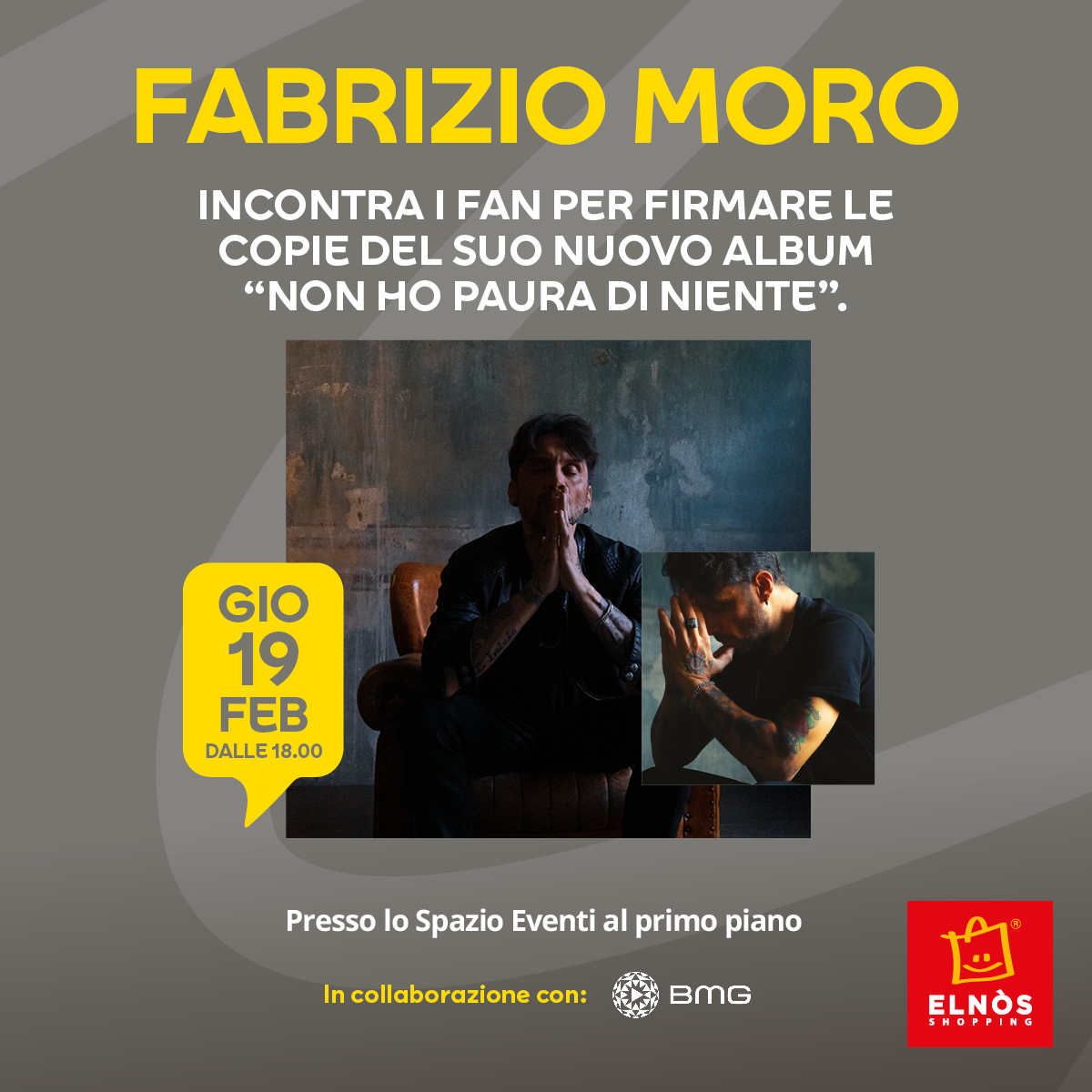 Fabrizio Moro incontrerà il pubblico per firmare le copie del suo nuovo album “Non ho paura di niente” presso lo Spazio Eventi al primo piano di ELNÒS Shopping. Tutti i partecipanti potranno scattare una foto con l’artista, portandosi a casa un ricordo davvero speciale.