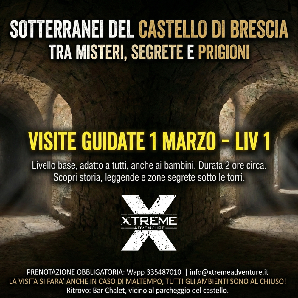 Oltre le imponenti mura e i giardini panoramici, esiste un mondo parallelo, fatto di silenzio, penombra e secoli di storia dimenticata. Xtreme Adventure, in collaborazione con l'Associazione Speleologica Bresciana che ci guideranno in quest'avventura, ti invita a varcare la soglia del tempo con una visita guidata esclusiva nei Sotterranei.