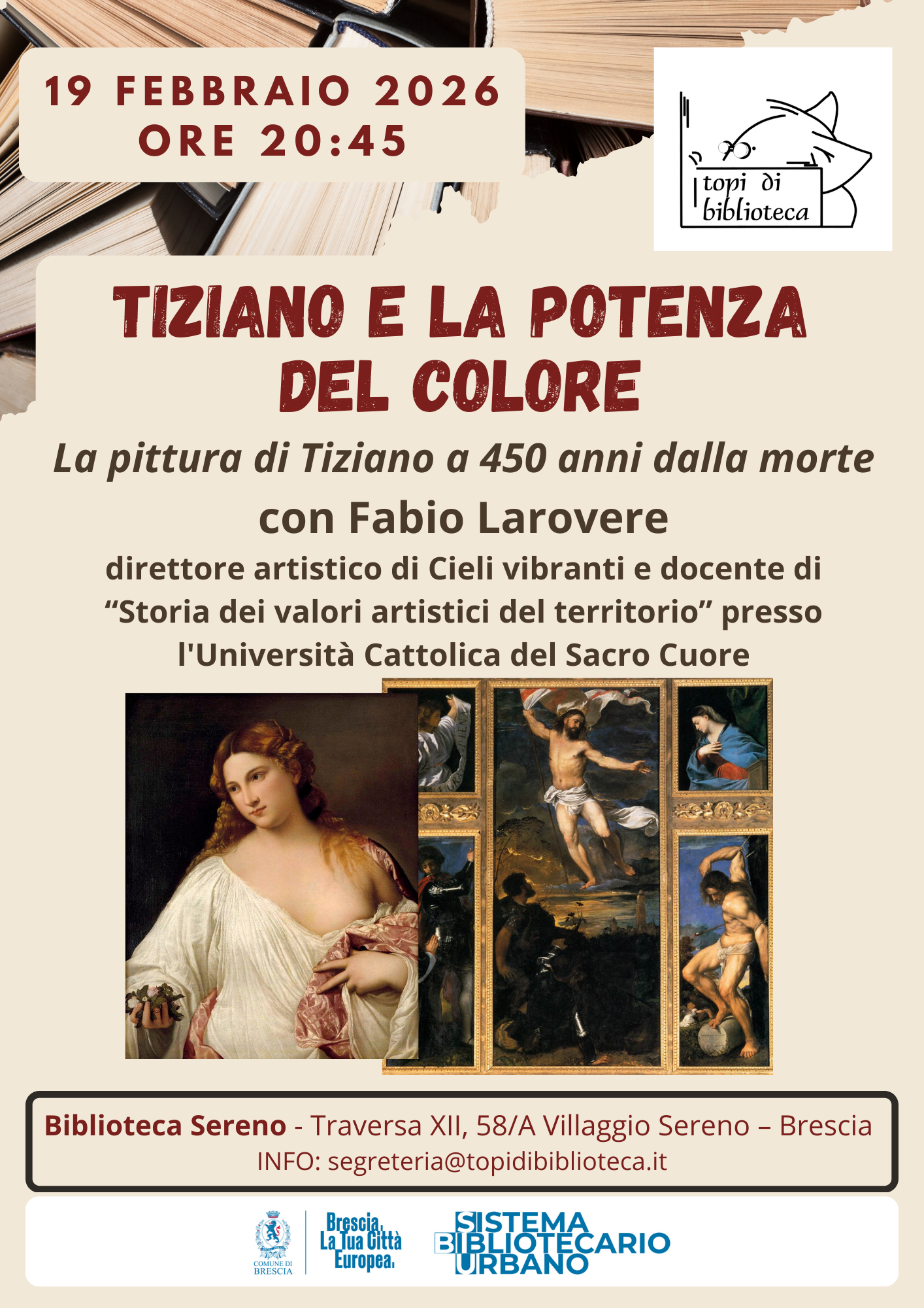 L'Associazione culturale "Topi di biblioteca ODV" promuove un incontro su "Tiziano e la potenza del colore. La pittura di Tiziano a 450 anni dalla morte".