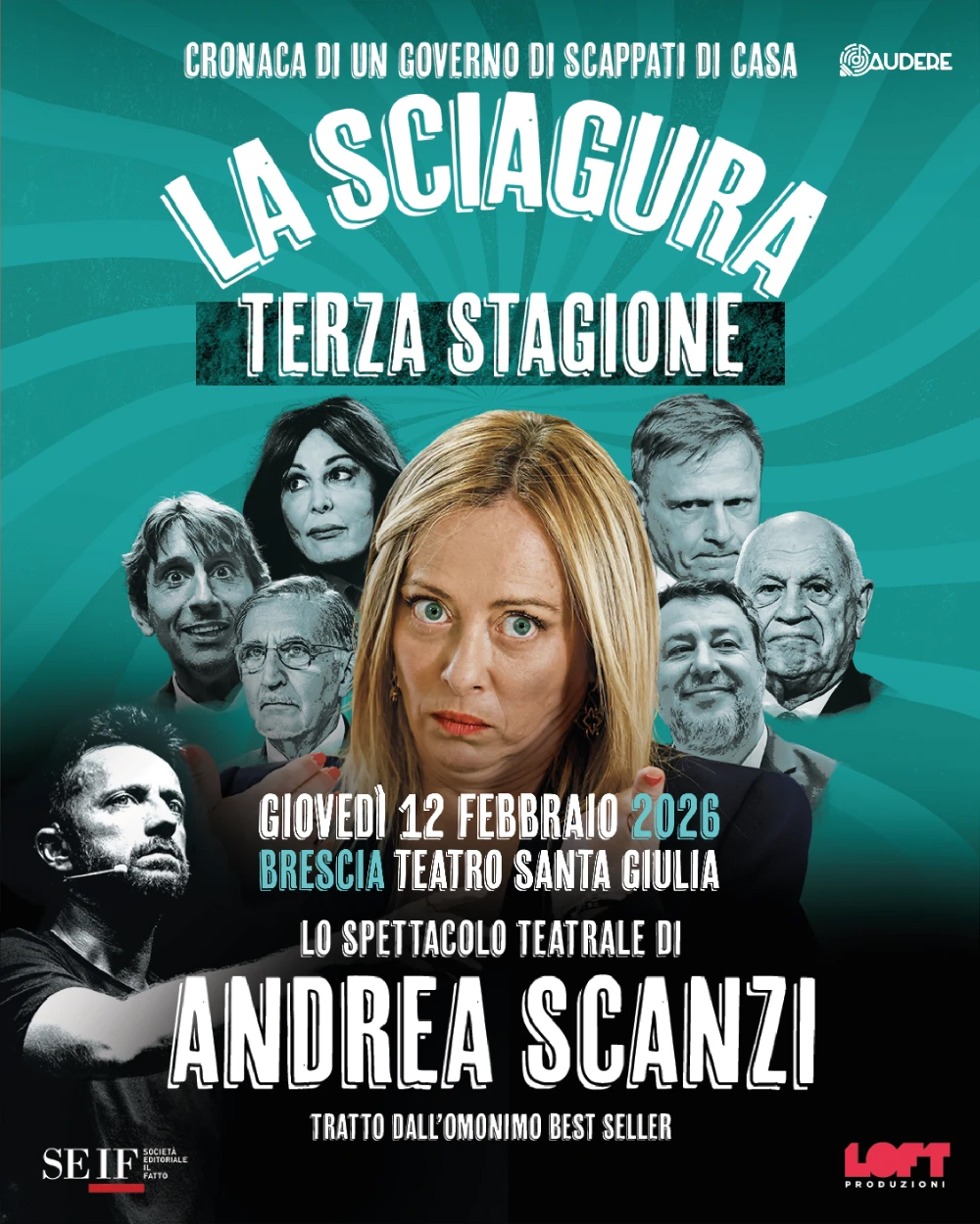 Dopo il grande successo di Renzusconi (2018) e Il cazzaro verde (2019-2020), Andrea Scanzi — autore e interprete teatrale dal 2011 — torna sul palco con un nuovo spettacolo di satira politica: La Sciagura – Cronaca di un governo di scappati di casa.